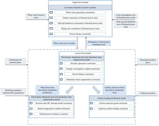 The dispatch strategy, which utilizes renewable energy and the inherent flexibility of electrolytic aluminum systems, represents a complex multi-stakeholder optimization challenge that involves both grid operators’ interests and aluminum producers’ benefits, where grid operators typically represent societal welfare by aiming to minimize overall power supply costs, while aluminum producers seek to maximize their own profits, with their strategic interaction naturally reaching an equilibrium state through market mechanisms; in actual operations, aluminum producers treat production data and output information as confidential business intelligence. Building upon the established electrolytic aluminum load modeling framework, this section proposes a novel electricity–aluminum bilevel optimization dispatch strategy that incorporates production safety constraints, employing a bilevel optimization model to formulate this equilibrium problem in system dispatch where the upper-level power dispatch model coordinates electricity distribution, while the lower-level model comprehensively considers aluminum production constraints and building heating requirements with thermal inertia limitations that define thermal demand parameters. Additionally, the latter incorporates carbon emission trading constraints to ensure operational safety, energy efficiency, and environmental compliance while maintaining necessary commercial confidentiality protections throughout the coordinated optimization process.