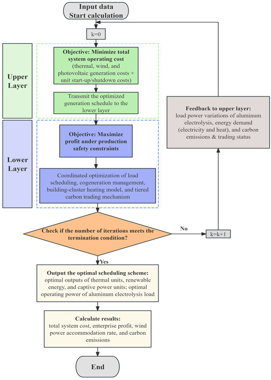 The overall computational process of the proposed model is illustrated in Figure 3. First, the model receives and organizes a series of input data, including the forecasted outputs of wind and photovoltaic power generation, conventional load demand, operational characteristics of thermal power units, and process parameters of aluminum electrolysis. Based on these inputs, the upper-level model performs the economic dispatch optimization of the power system with the objective of minimizing the total operating cost. It comprehensively considers the fuel cost and start-up/shutdown cost of thermal units, the generation characteristics of renewable energy, and power balance and system security constraints in order to determine the optimal generation portfolio of thermal, wind, and photovoltaic units. The resulting electricity price signals and power allocation plans are then transmitted to the lower level. At the lower level, the model carries out enterprise-side scheduling optimization under aluminum production safety constraints. By jointly optimizing the operating power and output of electrolytic cells, the output of captive power plants, the utilization of waste heat for district heating, and carbon trading strategies, the model achieves a comprehensive optimization of load responsiveness and economic performance. Meanwhile, the lower level feeds back key information—including the load response characteristics of aluminum electrolysis, aggregated energy demand (electricity and heat), and carbon emission status—to the upper level to support subsequent iterative dispatch decisions. Through iterative information exchange and coordinated optimization, the two levels progressively achieve source–load collaborative scheduling until convergence is reached. Ultimately, the model outputs the coordinated optimal generation plans for main-grid thermal units, renewable energy sources, captive power plants, and aluminum electrolysis loads, while also calculating comprehensive performance indicators such as total system operating cost, enterprise profit, wind power accommodation rate, and carbon emission levels.