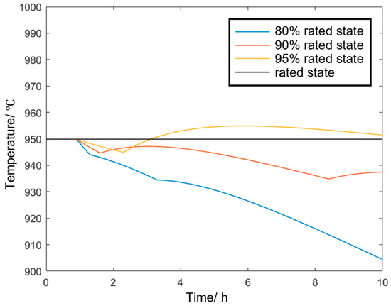The aluminum electrolytic cell enters different levels of continuous production reduction modes, and the temperature variations in the electrolyte–molten aluminum system are shown in Figure 6. It can be observed that when the production is reduced to 95% of the rated power, the aluminum electrolysis plant can restore the temperature through its own temperature regulation mechanism (i.e., by reducing the wind cooling); when the production is reduced to 90% of the rated power, although the plant can slow down the temperature drop through its temperature regulation mechanism, it is unable to restore the temperature to the rated value of 950 °C; when the production is reduced to 80% of the rated power, at the 5.2 h mark, the cell temperature drops below 930 °C, meaning that after 4.2 h of production reduction, the cell temperature exceeds the safety boundary.
