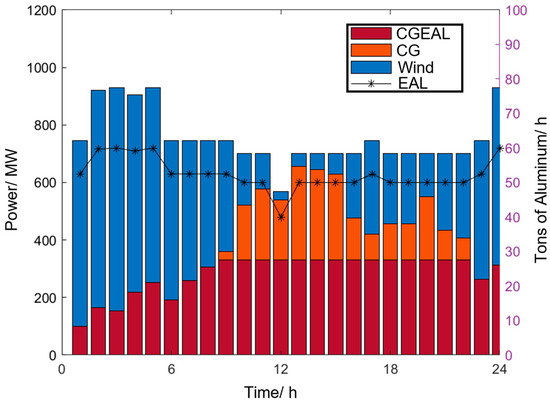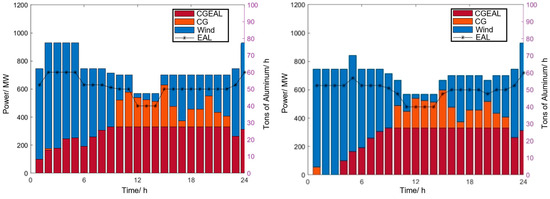 As shown in Figure 8, the left subfigure corresponds to the scheduling results of Scenario 0, while the right subfigure corresponds to those of Scenario 1. In Scenario 0, at the beginning and end of the day, the wind power generation is abundant and the corresponding electricity cost is relatively low. Therefore, the aluminum electrolysis load appropriately increases and operates in an overload mode to achieve more economical production. However, during the 12:00 h to 15:00 h period, the wind power output decreases, resulting in higher electricity costs. Consequently, the aluminum electrolysis plant reduces its load and enters a low-load operation mode to minimize production costs. Although a certain amount of wind curtailment still occurs between 0:00 h and 1:00 h, the aluminum electrolysis load has already been operating continuously in overload mode for four hours (from 1:00 h to 5:00 h). Due to production safety and operational constraints, the overload duration has reached its upper limit and cannot be further extended.