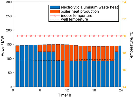The curve of indoor temperature in buildings under Scenario 2 is shown in Figure 10 above. Since the thermal inertia of the buildings is not considered, the temperature of the buildings will always be maintained at 20 °C, and the waste heat from electrolytic aluminum cannot be fully utilized, resulting in the need for boilers to generate heat for central heating during the day. Compared with Scenario 1, Scenario 2 uses industrial waste heat, which reduces the carbon emissions from building heating from 1052 tons to 266 tons, a total reduction of 786 tons. However, due to the increased production capacity of electrolytic aluminum, the carbon emissions from electrolytic aluminum production have increased by 1044 tons. The total carbon emissions have increased by 258 tons compared with Scenario 1, but they still decreased by 4.8% compared with Scenario 0.