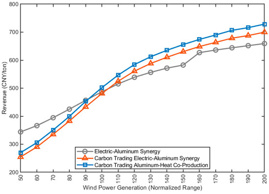 Figure 11 shows the revenue of electrolytic aluminum producers under Scenarios 0, 1, and 3 at different wind power generation levels, where 100% represents the rated wind power capacity, and 200% represents the output when the installed capacity is twice the current installed capacity under full load operation. It can be found that the production revenue of aluminum–heat cogeneration under carbon trading in Scenario 3 is always better than that of the electricity–aluminum synergy scenario under carbon trading, which is due to the additional revenue generated by the sale of waste heat.