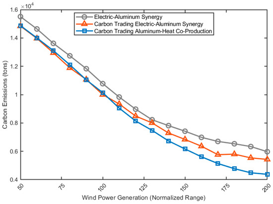 Figure 12 shows the carbon emissions of electrolytic aluminum producers in Scenarios 0, 1, and 3 at different wind power generation levels. After considering the carbon trading mechanism, carbon emissions are significantly reduced. Regardless of the wind power generation level, the total carbon emissions under the scenarios considering the carbon trading mechanism are lower than those under the scenarios not considering the carbon trading mechanism, which indicates the role of the carbon trading mechanism in reducing carbon emissions. We found that due to the increased aluminum production resulting from the aluminum–heat cogeneration under the carbon trading mechanism in Scenario 3, the carbon emissions increase, even exceeding those in the scenario of electricity–aluminum synergy under the carbon trading mechanism in Scenario 1. However, through the simulation in this section, it can be observed that under the condition of high wind power generation level, although the aluminum–heat cogeneration under the carbon trading mechanism in Scenario 3 will increase aluminum production due to the heating demand, the use of wind power will not lead to additional increase in carbon emissions. Therefore, the carbon emissions in this case will be lower than those in the scenario of electricity–aluminum synergy under the carbon trading mechanism in Scenario 1. The proposed aluminum–heat cogeneration model under the carbon trading mechanism not only achieves the highest revenue but also can realize the lowest carbon emission level under the condition of high wind power generation level, which also indicates the impact of wind power generation level on carbon emissions.
