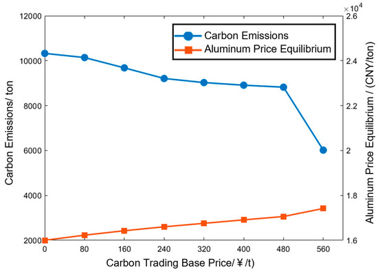 Figure 13 shows the changes in the carbon emission quota of electrolytic aluminum producers as the basic price of carbon trading gradually increases from 0 CNY/ton to 560 CNY/ton, as well as the price of finished aluminum when electrolytic aluminum producers maintain a break-even level, that is, the price of finished aluminum required for electrolytic aluminum producers to maintain the profit level at the basic carbon trading price of 0 CNY/ton. It can be observed in the figure that the carbon emission quota of electrolytic aluminum producers has decreased by 41.7%, but in order to maintain the same profit, the aluminum price needs to rise from 16,000 CNY/ton to 17,417 CNY/ton.