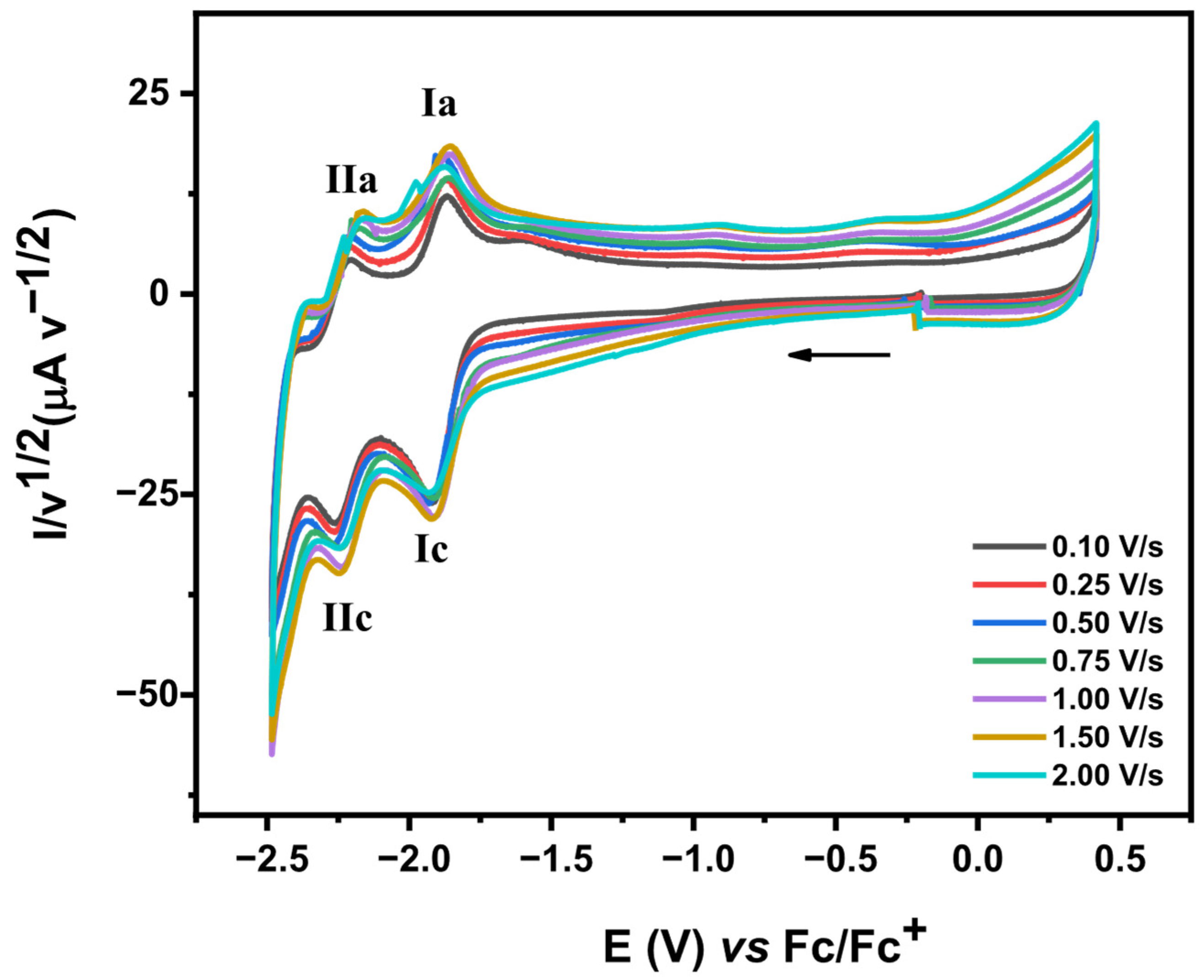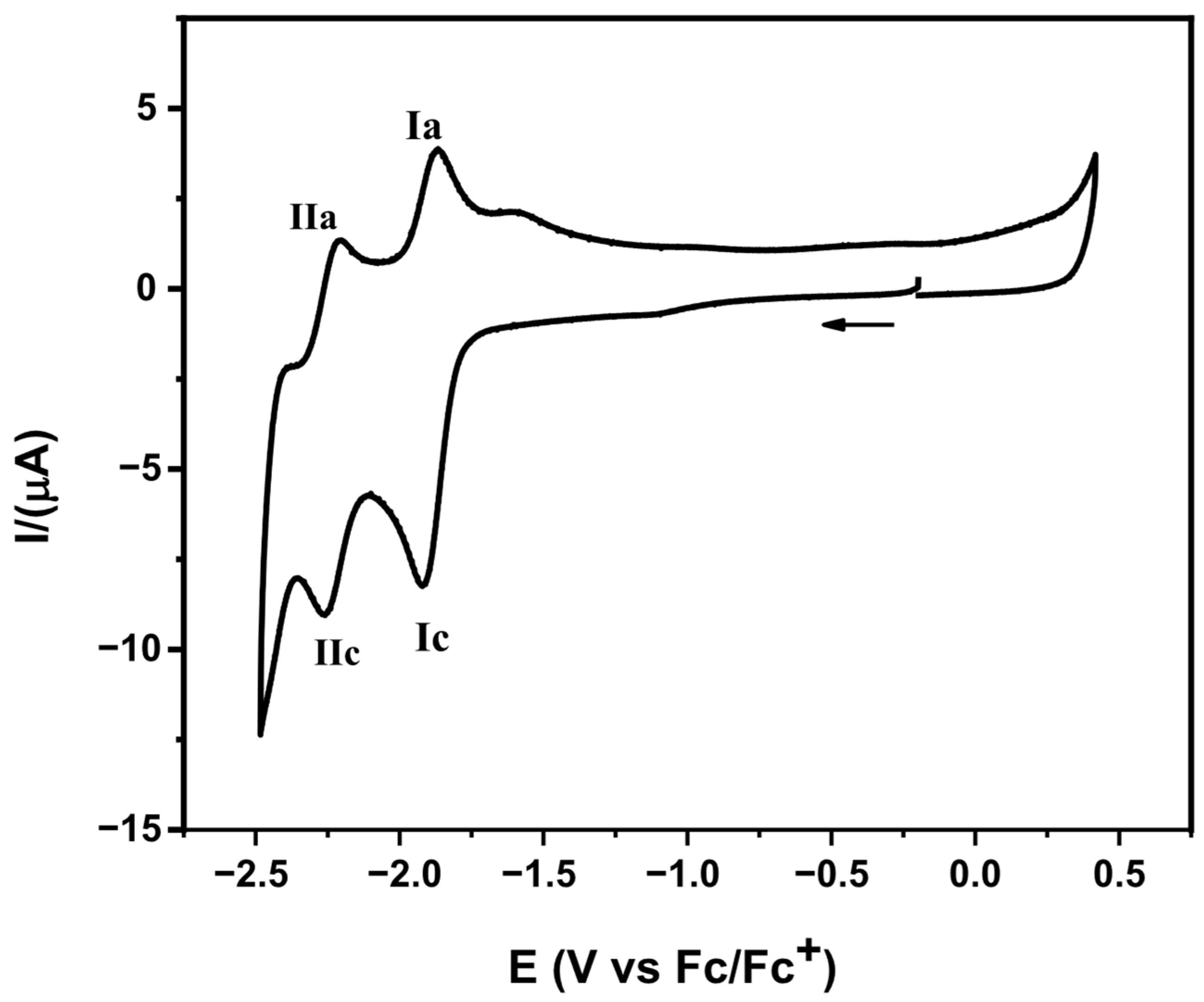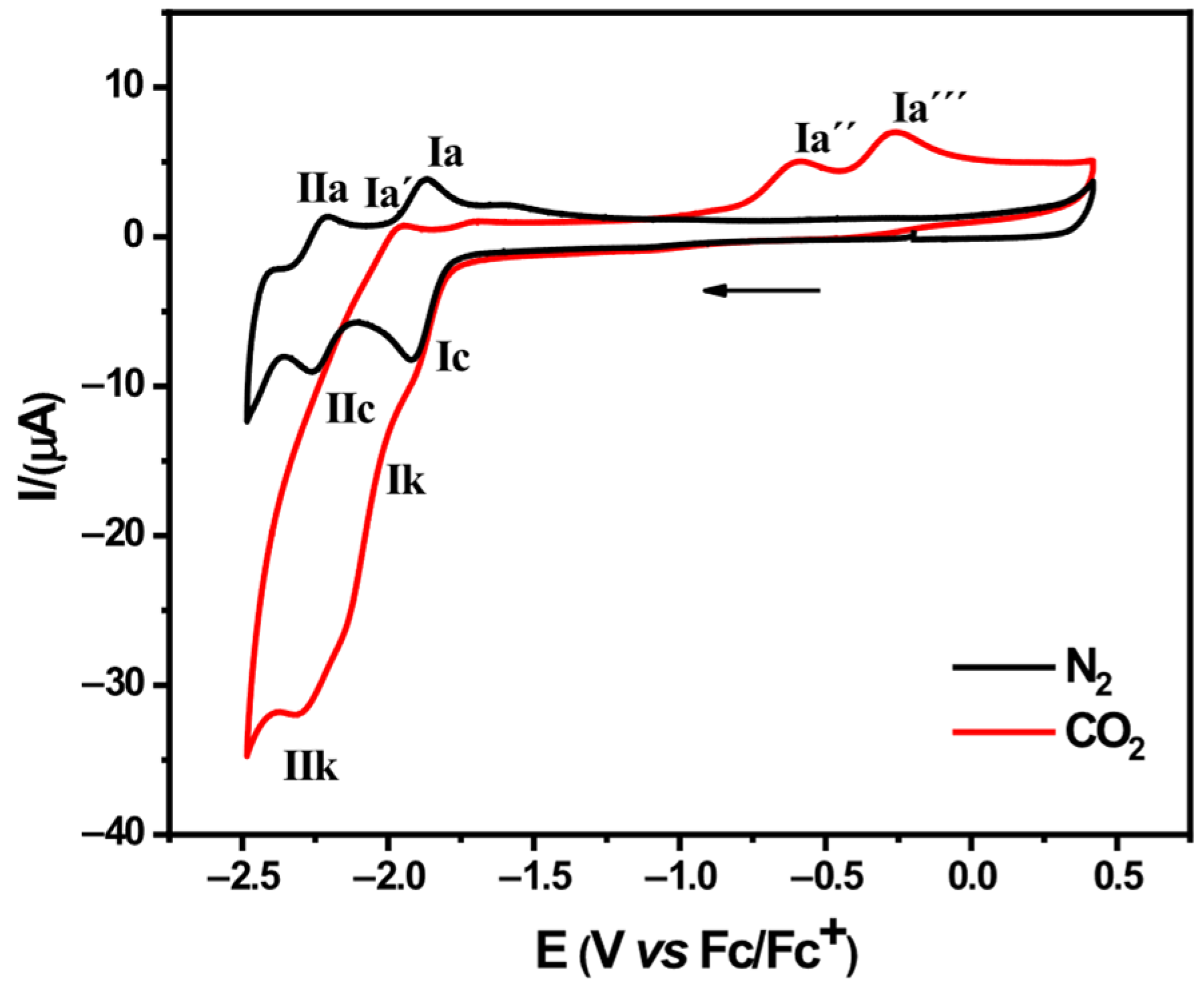 2.4. Electrochemical Study of Compounds in the Presence of N2 and CO2