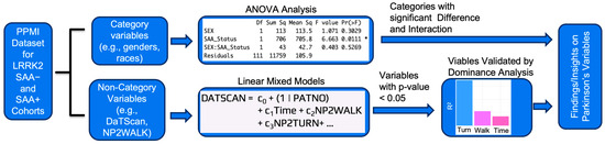 Figure 1 summarizes the overall analysis pipeline, while detailed descriptions of each step are provided in the subsections. The workflow begins with the integration of 52 variables from 10 PPMI datasets for 115 LRRK2 carriers stratified by SAA status. Two outcomes were modeled: DaTScan as an imaging marker of early dopaminergic decline and NP3TOT as a clinical measure of motor severity. Data from the Parkinson’s Progression Markers Initiative (PPMI) were compiled into a CSV file with patients as rows and variables as columns and processed in R (RStudio 2025.05.1). The dataset included both categorical variables (e.g., sex, diagnosis group, medication status, age categories) and non-categorical variables (e.g., motor and non-motor scores, imaging, biomarker levels). For categorical variables (sex, race, ethnicity, handedness, age), two-way ANOVA was applied to test the effects of SAA status on DaTScan and NP3TOT, with interactions (e.g., SAA × sex) considered and Tukey HSD used for post hoc comparisons. For non-categorical variables, linear mixed-effects models (lmer() function, R lme4 package [43]) were constructed for SAA− and SAA+ cohorts separately, with time and clinical, cognitive, autonomic, or biomarker predictors as fixed effects and patient ID as a random intercept. These models identified predictors of longitudinal change in DaTScan (early dopaminergic decline) and NP3TOT (motor severity) while accounting for repeated measures. To complement these models, dominance analysis [44,45] quantified the relative R2 contribution of each predictor across subset models, providing a measure of variable importance even though statistical significance is not directly estimated. Together, this framework integrated categorical comparisons, longitudinal modeling, and predictor ranking to identify robust drivers of progression in LRRK2+ patients stratified by SAA status.