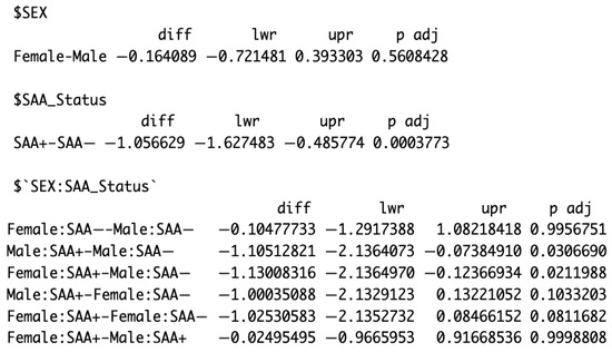 Example of ANOVA analysis showing the effects of sex and SAA status on DaTScan binding ratios with post hoc comparisons. The “$” symbol is a notation automatically generated by RStudio to indicate a variable or factor in ANOVA.