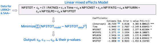 To illustrate the general procedure of linear mixed-effects modeling, Figure 3 presents an example evaluating the influence of domain-specific variables from the MDS-UPDRS_Part_I (e.g., NP1CNST, NP1FATG, NP1URIN, NP1SLPD, NP1PTOT) on the output variable, NP3TOT, for LRRK2+ SAA− cohorts. Similar approaches were implemented to develop linear mixed-effects models for LRRK2+ SAA+ cohorts with NP3TOT or DaTScan as the outputs. In the model, Time was included as a fixed effect to capture the average change between repeated visits for the same patient (i.e., longitudinal measurements per participant). A coefficient ci, i changed from 1 to 8, was assigned to each input variable for the case study shown in Figure 3. As typically implemented in mixed effects models for longitudinal data, a random intercept for patient number (PATNO), specified as c0(1 | PATNO), was included to account for the non-independence of repeated measures within the same individual for the visit record. This random intercept allows each patient to have a unique baseline value [46], while the fixed effects (represented by ci) estimate the average relationship between predictors and the outcome across all patients. Time was modeled as a non-categorical variable (months since baseline), and only random intercepts were used to represent baseline variability across subjects. Random slopes (e.g., time × predictor) were not included to maintain model stability and interpretability, given the limited number of repeated measurements per participant. In this specification, all patients share the same slope for time, reflecting a common average rate of change, but differ in their intercepts.