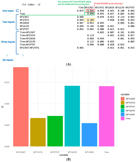 Dominance analysis evaluates the relative importance of predictors by examining how much each variable contributes to the model’s explanatory power, as measured by the change in R2. The basic idea is to add predictors sequentially and quantify the increase in R2 that results from including each new variable. For the example shown in Figure 3, dominance analysis was applied and illustrated in Figure 4A. When NP1CNST (constipation) is the only input for the model, its contribution to R2 is 0.085 (marked in RED in Figure 4A). When it is added to a model already containing Time, the R2 is increased by 0.098 (marked in GREEN in Figure 4A). This improvement reflects the additional explanatory contribution of NP1CNST beyond what is explained by Time alone. Similarly, the increase of R2 is 0.105 if NP1CNST is added into the model with NP1FATG (marked in YELLOW). Dominance analysis then extends this logic by considering all possible combinations of predictors, i.e., three to six inputs. Each variable’s contribution is assessed across single-input models, two-input models, three-input models, and so forth. By averaging the incremental R2 contributions across all possible model combinations, a robust measure of each predictor’s overall importance can be obtained. Figure 4B summarizes these averaged contributions, showing the mean explanatory power of each variable across all combinations rather than from individual models. For example, the average contribution of NP1CNST across all model combinations can be read from the NP1CNST column in Figure 4A. This averaging process yields the final dominance values, which are visualized in Figure 4B. Here, NP1CNST, NP1SLPD (sleep problems), and Time emerge as the strongest contributors to explaining variance in NP3TOT. The most dominant factors identified by dominance analysis are consistent with those highlighted by the linear mixed-effects models in Figure 3. While the mixed-effects models evaluate all variables simultaneously, dominance analysis assesses the contribution of each predictor across models with different numbers and combinations of variables, providing an additional perspective on their relative impact. However, dominance analysis does not quantify statistical significance. In this study, it is therefore used as a complementary tool to validate and reinforce the importance of the factors identified by the linear mixed-effects models.