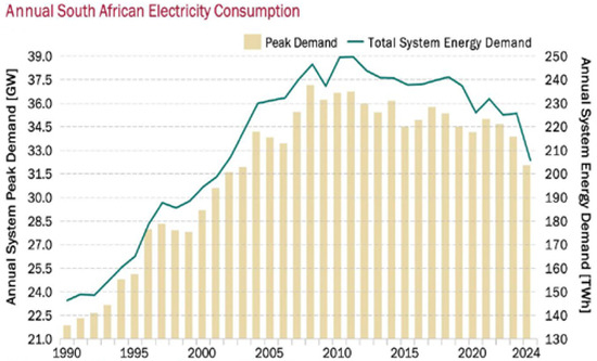 According to the Centre for Renewable and Sustainable Energy Studies (CRSES) [24], South Africa’s total electricity demand has declined over the past decade, despite relatively stable peak levels (see Figure 1). From a peak of around 245 TWh in the early 2010s, annual system demand fell to below 210 TWh by 2024, reflecting both economic stagnation and growing grid unreliability. This decline underscores the urgency for diversifying generation and modernising the grid [24].
