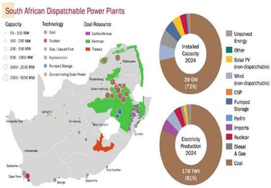 As shown in Figure 2, the dominance of coal is visually reflected in 2024 projections, where coal comprises 72% of installed dispatchable capacity (39 GW) and 81% of electricity production (178 TWh), according to the Centre for Renewable and Sustainable Energy Studies (CRSES) [24]. Most large-scale coal plants are in the country’s north and northeast, where Carboniferous and Permian coal seams are concentrated. Other dispatchable technologies, such as pumped storage, hydro, nuclear, and gas, exist but make up a significantly smaller share of generation. Non-dispatchable sources like solar PV and wind, while growing, remain underutilised in the national mix due to policy delays and grid constraints [28]. To address these converging crises, South Africa’s Integrated Resource Plan (IRP) 2019 proposes a fundamental restructuring of the power system. It targets the decommissioning of over 10 GW of coal, and the addition of 6 GW of solar PV, 14.4 GW of wind, and 2 GW of battery storage by 2030 [12]. The Just Energy Transition (JET) framework supports this transformation by addressing socio-economic risks, especially for the coal-reliant Mpumalanga province, which faces the potential loss of more than 120,000 jobs [13,29].