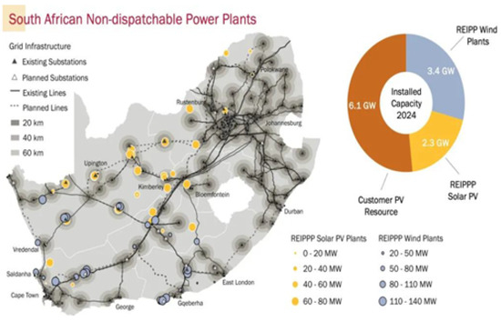 As shown in Figure 3, South Africa has already procured a total of 6.1 GW of non-dispatchable renewable energy under the REIPPPP programme by 2024, comprising 3.4 GW of wind and 2.3 GW of solar PV. These Independent Power Producer (IPP) installations are widely distributed, with strong spatial alignment to existing and planned grid infrastructure, particularly in the Northern, Eastern, and Western Cape regions. However, integration into the national system remains constrained by grid congestion and insufficient substation capacity. While positive progress has been made in South Africa, there, however, remains underutilisation of the abundance of solar and wind resources. South Africa continues to underutilise these resources due to policy delays, grid bottlenecks, and institutional inertia [28]. In this context, Hybrid Renewable Energy Systems (HRESs) are increasingly recognised for their ability to decentralise supply, improve reliability, and enable low-emissions development [10,17]. These systems represent a technically feasible and socially responsive pathway toward a more just and sustainable electricity sector [22].