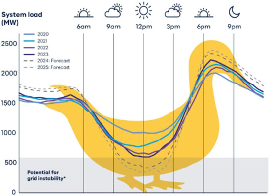 In Northern Cape mining operations, PV–Wind–Battery hybrids have reduced grid dependency by more than 40%, while maintaining stable power quality critical to mechanised operations [19,31]. EMS-coordinated Battery Energy Storage Systems (BESSs) support frequency regulation and black-start capability, making them vital for critical infrastructure resilience [5,23]. Moreover, HRESs reduce curtailment of intermittent sources by enabling time-shifting of energy through storage integration, thus smoothing the duck curve observed in PV-dense regions [50,51]. See Figure 5 for an example of a duck curve.