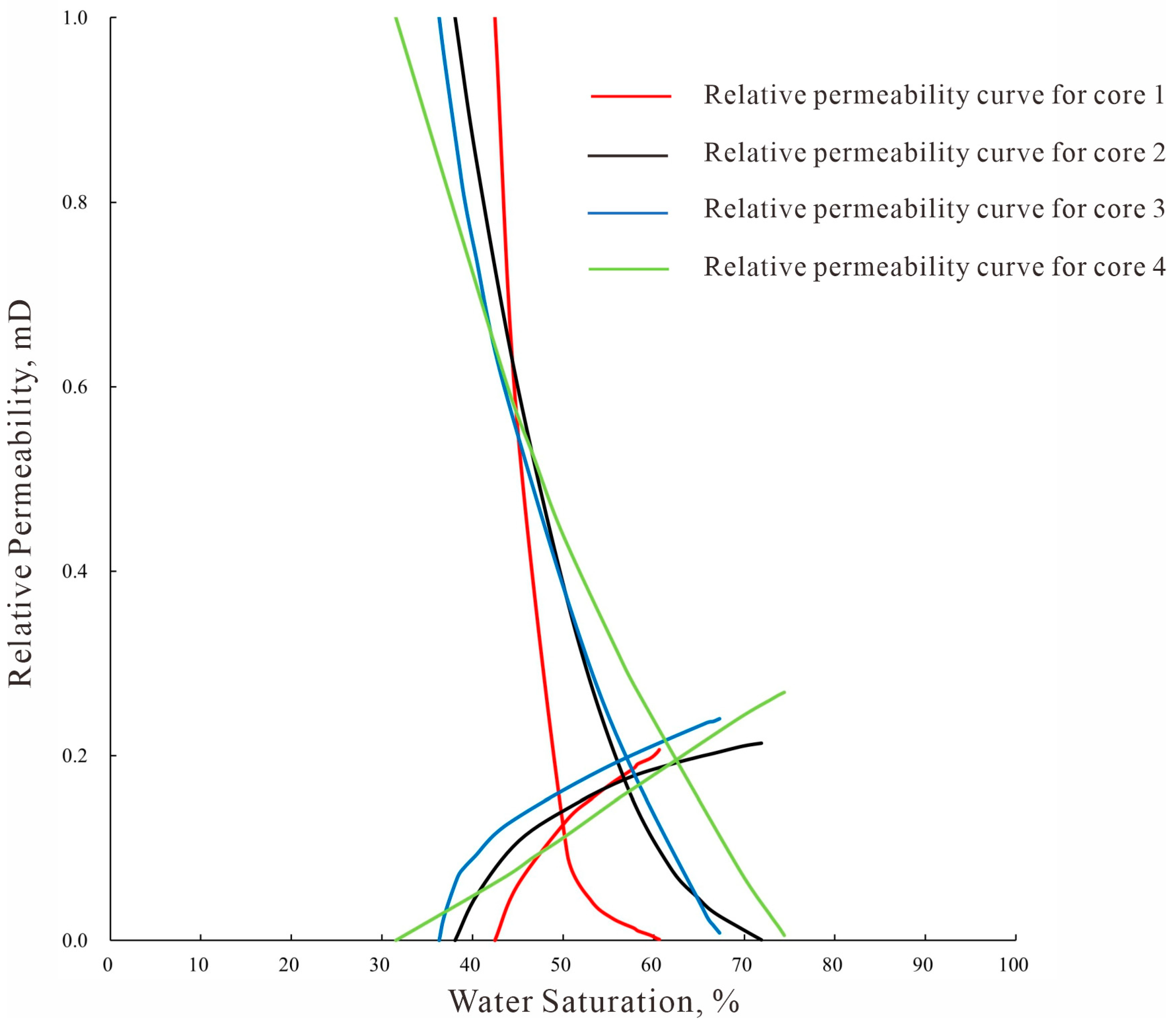 The relative permeability curves derived from data processing of the four core samples are presented in