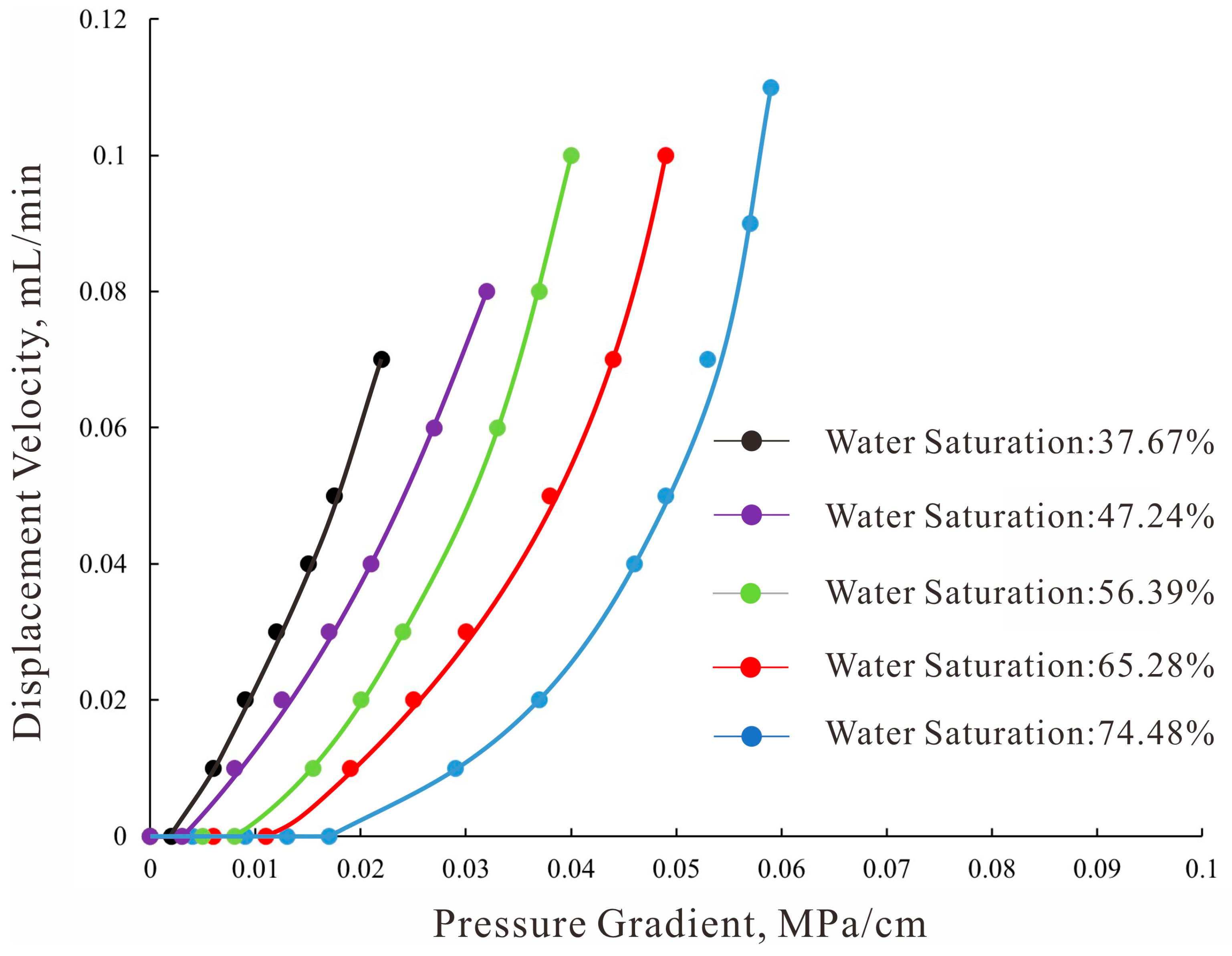 8]. For cores with comparably low permeability, the coupling effect of permeability and pressure gradient reduces both irreducible water and residual oil saturation, expands the two-phase flow region, and enhances displacement efficiency phenomena primarily attributed to capillary and boundary layer effects [