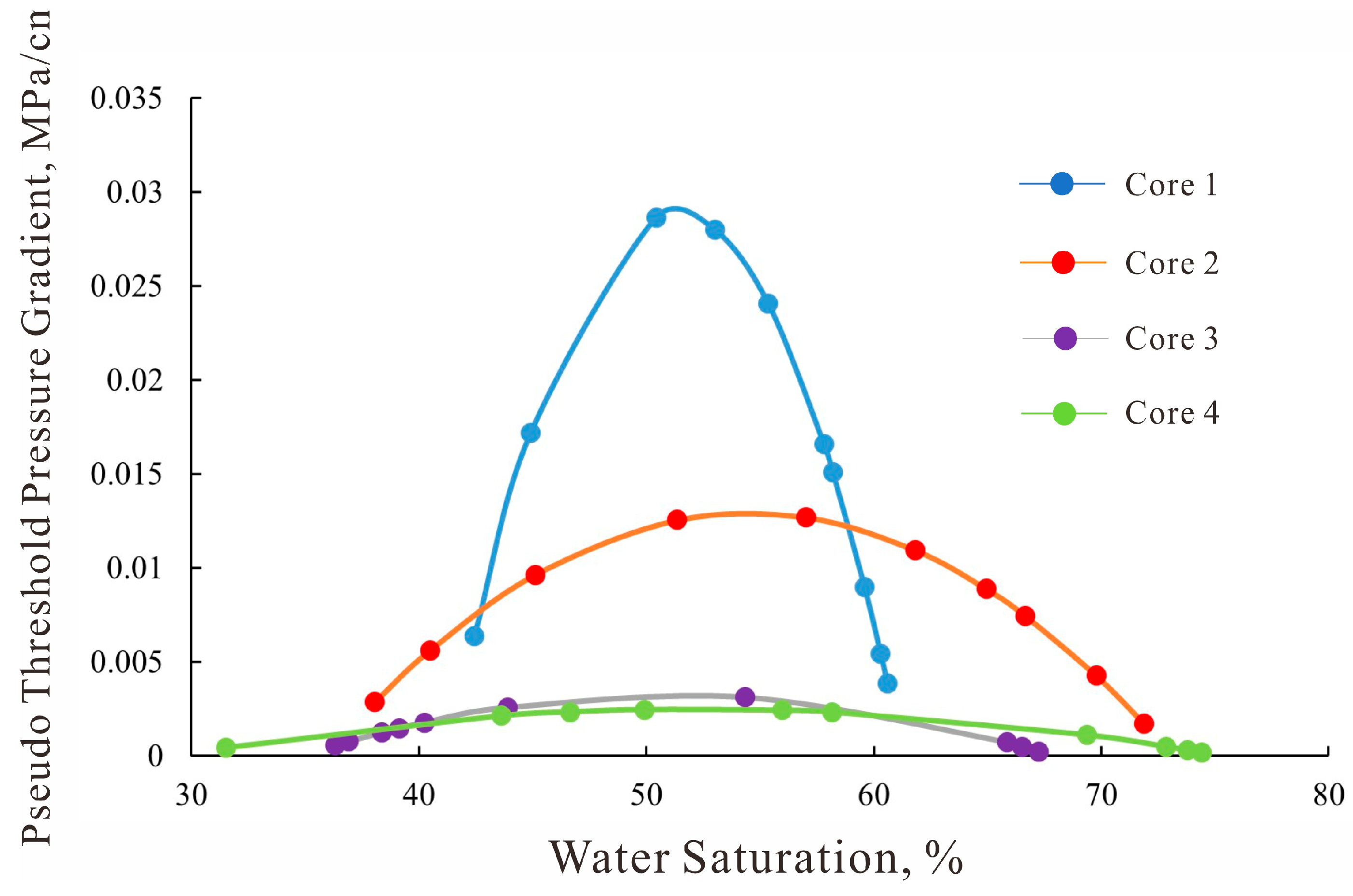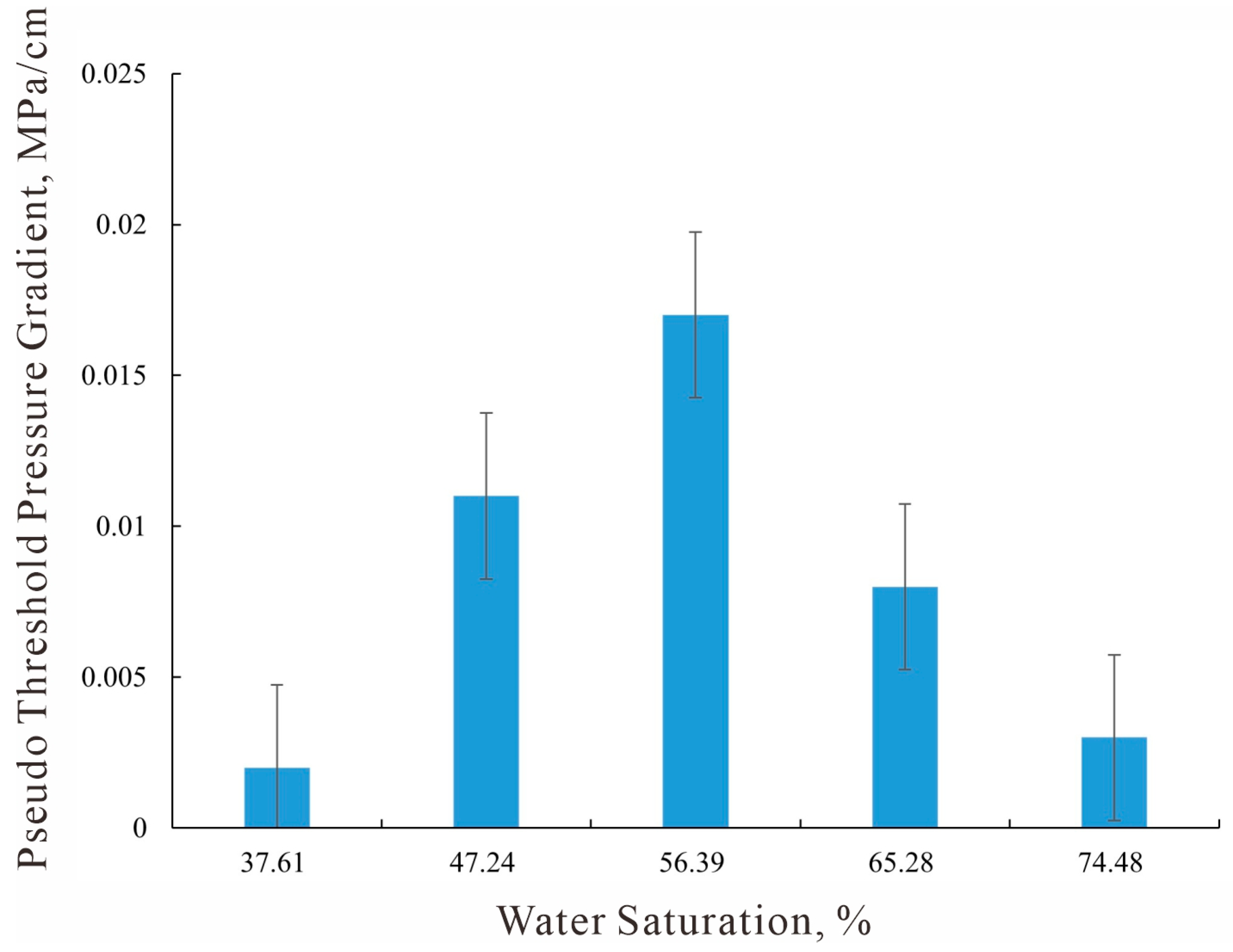 Figure 3, the pseudo threshold pressure gradient exhibits a unimodal trend with increasing water saturation, rising initially before declining and peaking at a specific saturation level.