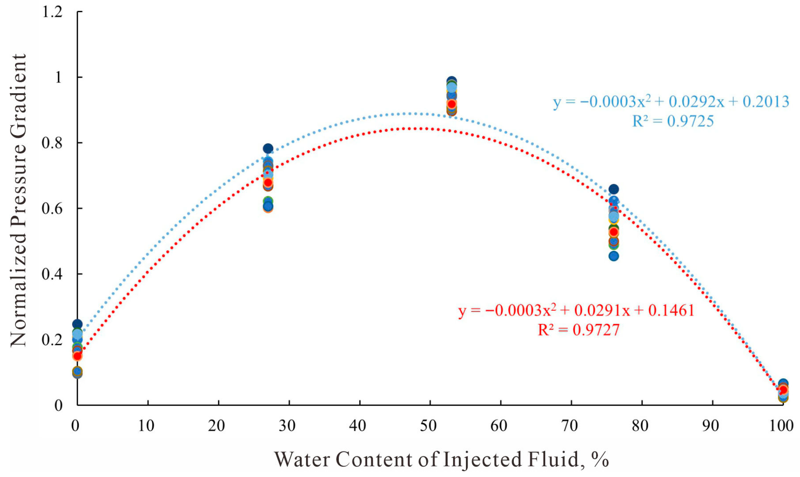 In the quasi-threshold pressure gradient measurements for low-permeability sandstone cores, we used native core samples and maintained the experimental temperature at 50 °C. The test fluids included simulated oil prepared by blending crude oil with kerosene to achieve a viscosity of 6.44 mPa·s and synthetic formation water. The water cut of the injected fluid (denoted as F