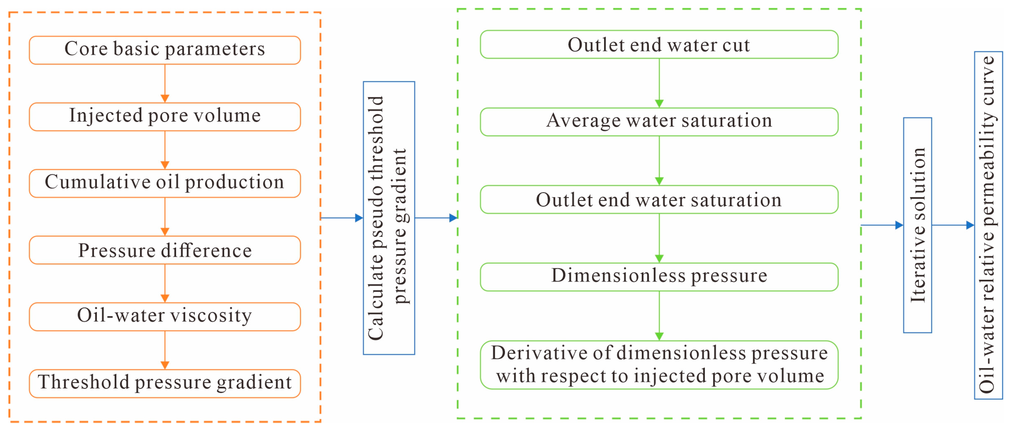 , oil–water viscosities, and threshold pressure gradients, etc.). Next, using the two-phase flow pseudo-threshold pressure gradient characterization method, calculate the pseudo-threshold pressure gradient of the tested core at different water saturations. Then, based on the above experimental parameters, compute the water cut at the core outlet, average water saturation, water saturation at the outlet, dimensionless pressure, and the derivative of dimensionless pressure with respect to injected pore volume multiples at each time point. Finally, determine the oil–water two-phase relative permeability in low-permeability reservoirs using the iterative method. The flowchart is shown in