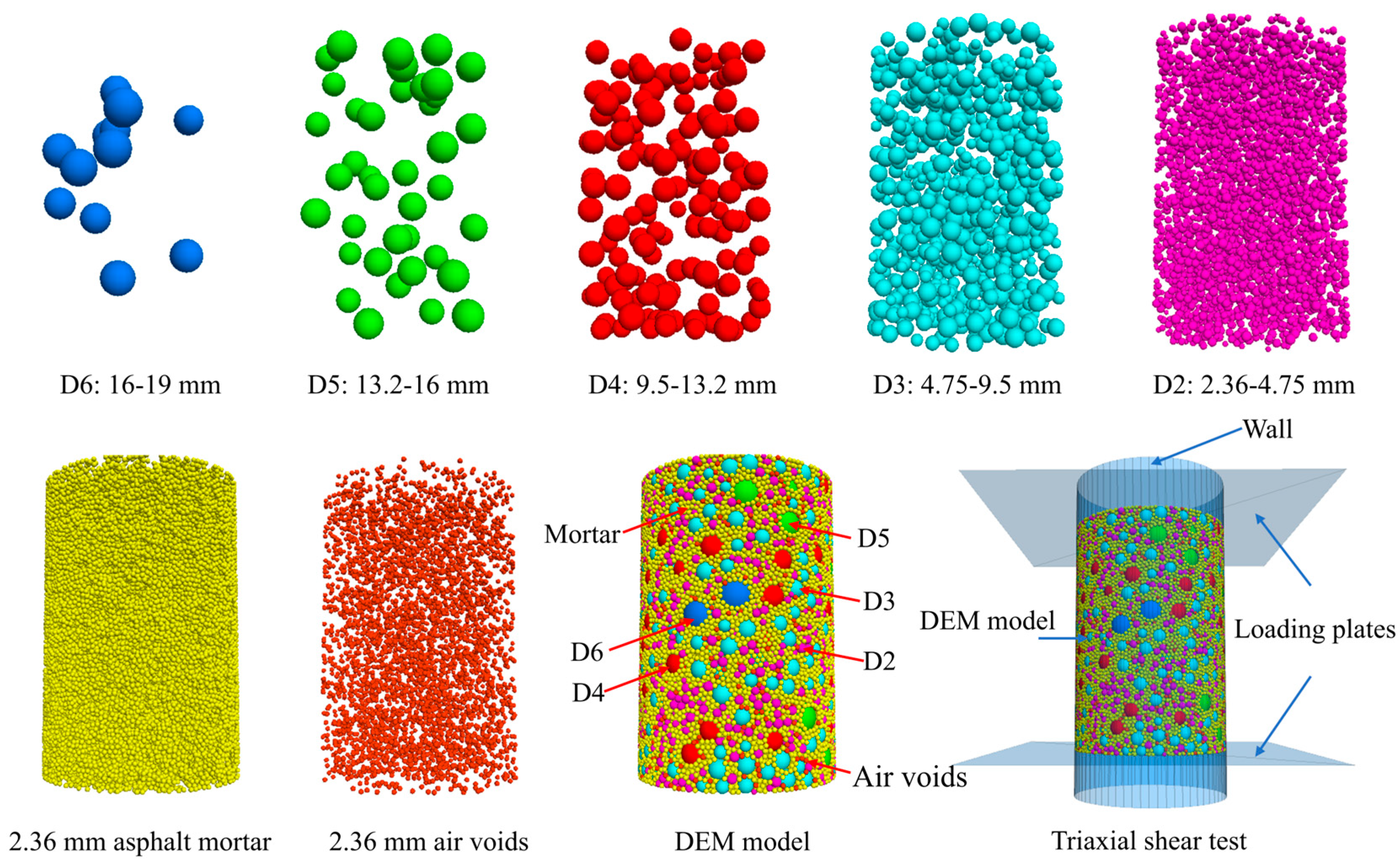 - Yang, J.; Zhang, X.; Zhu, H. Discrete element simulation on triaxial shear test of asphalt mixtures. J. Build. Mater. 2012, 15, 64–68. [Google Scholar] [CrossRef]