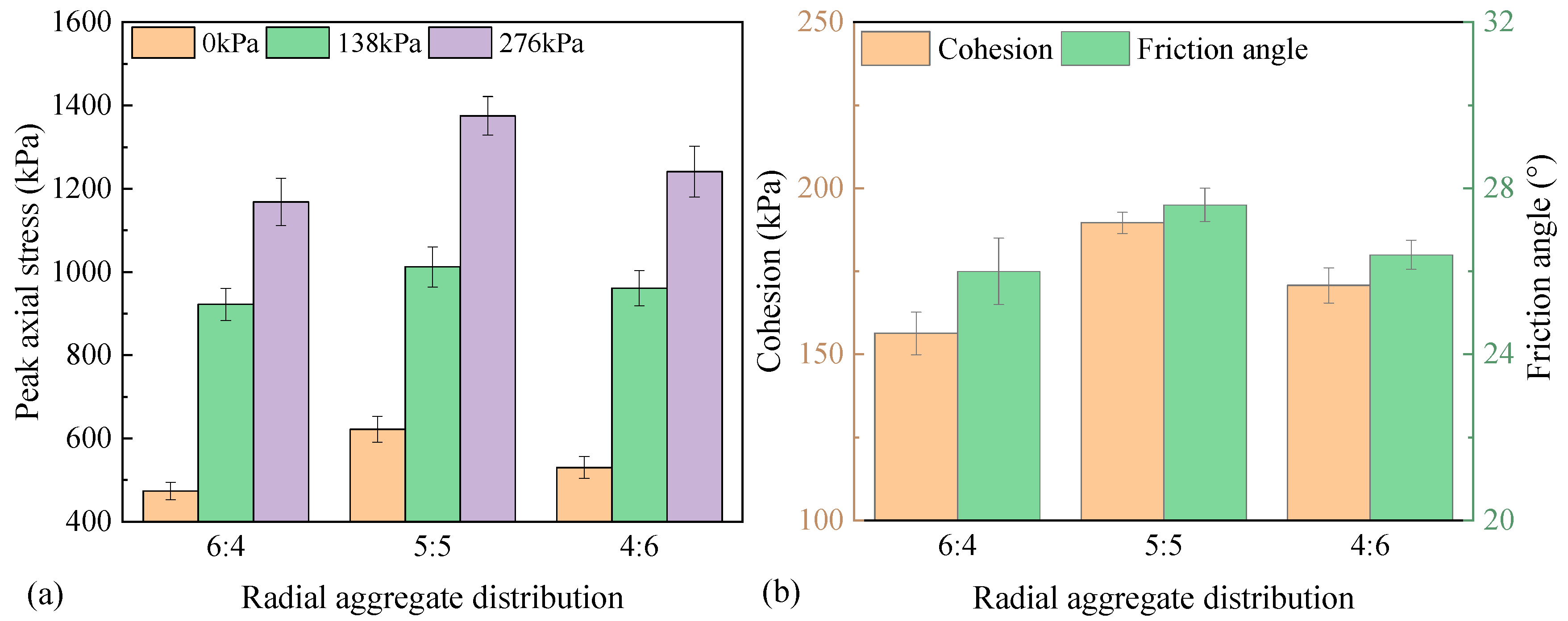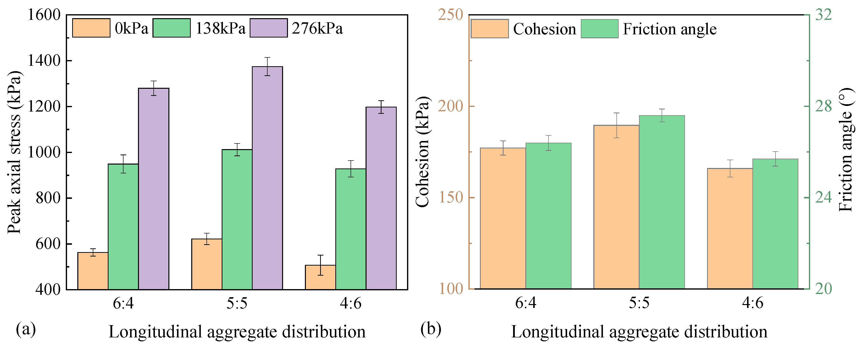 - Aggregate characteristics exert a dominant influence on shear resistance. A uniform radial or longitudinal aggregate distribution (outer-to-inner or upper-to-lower ratio of 5:5) increased cohesion by 21.3–27.6% and internal friction angle by 4.6–7.4% compared with nonuniform configurations (6:4 or 4:6 ratios), indicating that field compaction standards should emphasize aggregate homogeneity rather than density alone. Moreover, each 0.1 increase in aggregate friction coefficient enhanced cohesion by 7.2% and internal friction angle by 5.6%, suggesting that the use of high-friction, angular aggregates should be prioritized in mix design to improve skeleton stability instead of relying solely on binder modification.