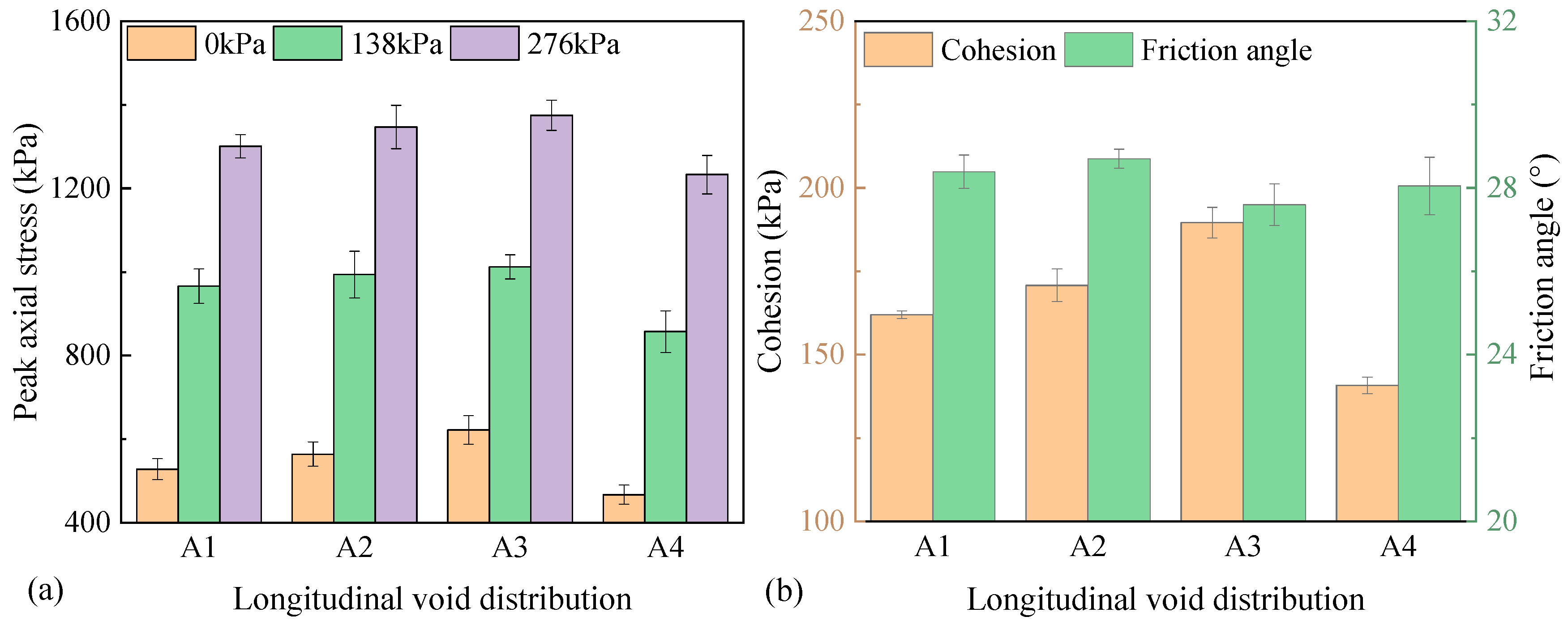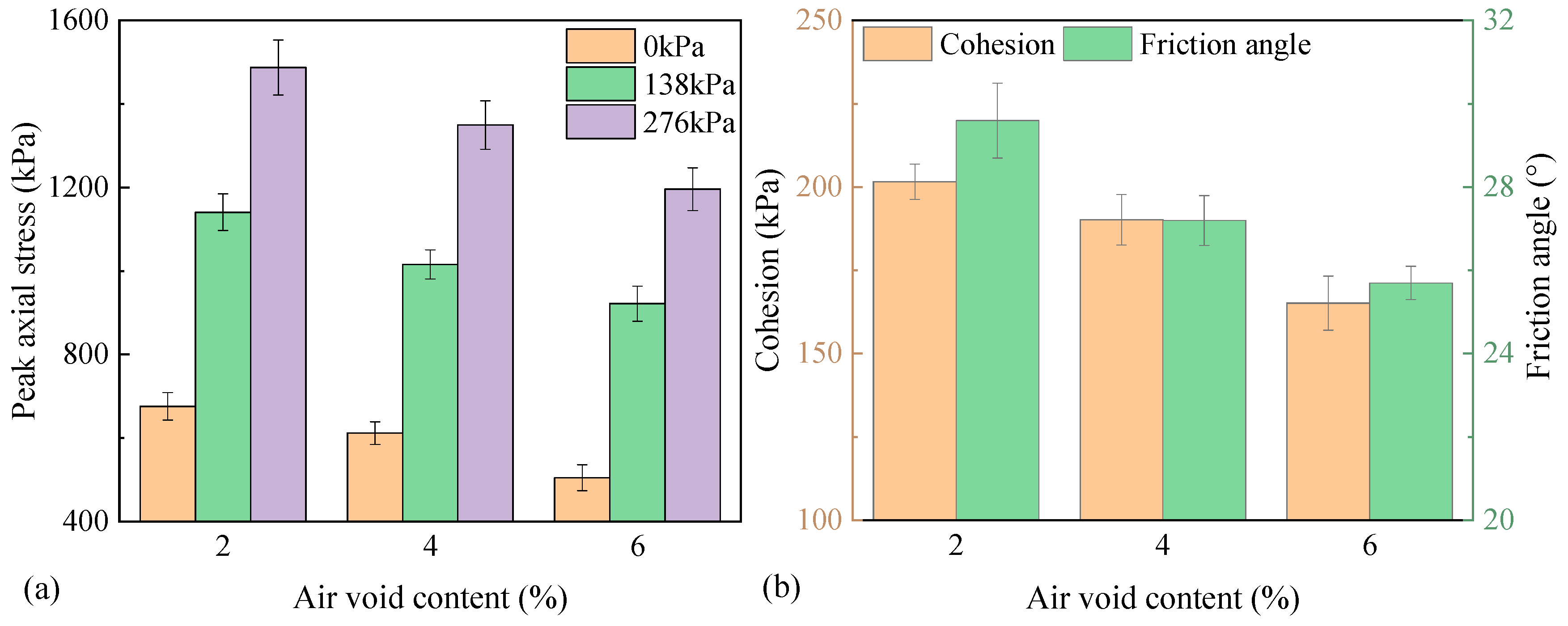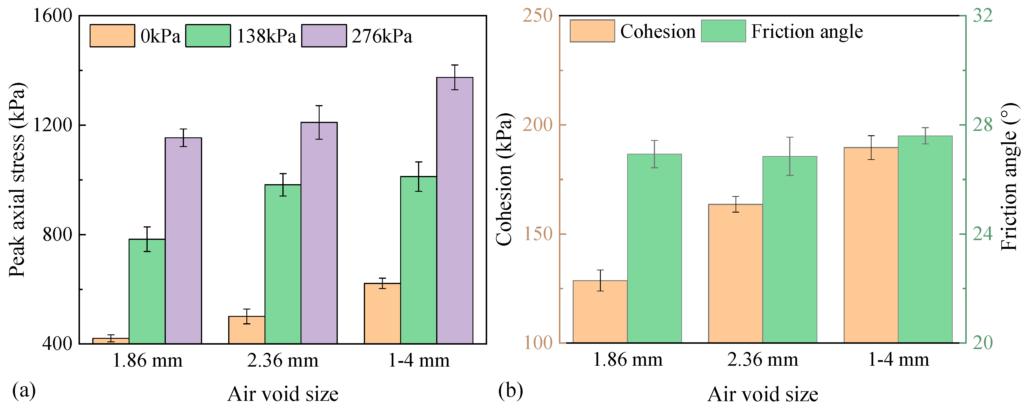- Void characteristics also play a critical role in shear performance. A uniform longitudinal void distribution optimized stress transmission and particle contact, whereas nonuniform distributions—especially those with higher voids in the upper region—caused stress concentrations and reduced shear strength. Increasing air-void content led to a distinct loss of shear resistance, with each 2% increase in air-void content resulting in an average 11.9% reduction under 138 kPa confinement. Furthermore, a continuous void size range of 1–4 mm improved axial peak stress, cohesion, and internal friction angle by 2.5–47.8% compared with single-sized voids, owing to enhanced particle interlocking and stress diffusion. These results suggest that both void content and size distribution should be included as quantitative indicators in laboratory mix design and field compaction quality control.