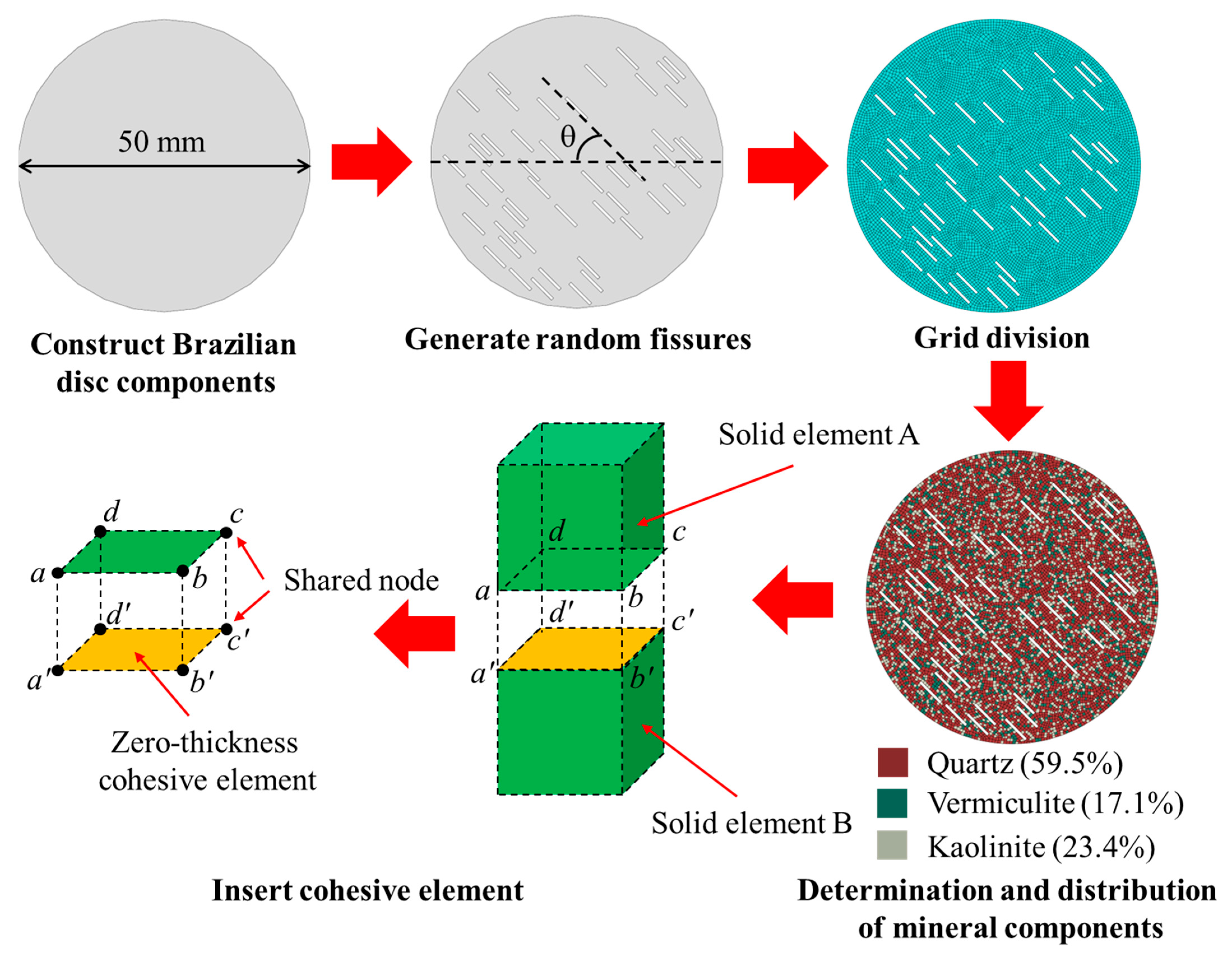 27]. In recent years, the development of random fissure modeling and micro–macro damage mechanics methods has provided new ideas for solving these problems. Scholars have explored the failure mechanism of fissured rock masses through methods such as FDEM and PFC, but there is still a lack of research on the tensile behavior under the coupling effect of differential mineral component assignment and random fissure spatial statistical distribution. Especially in sandstone with multiple mineral components, the interaction mechanism between fissure geometric parameters (inclination angle and density) and the spatial distribution of minerals on the influence of crack propagation path is still unclear.
