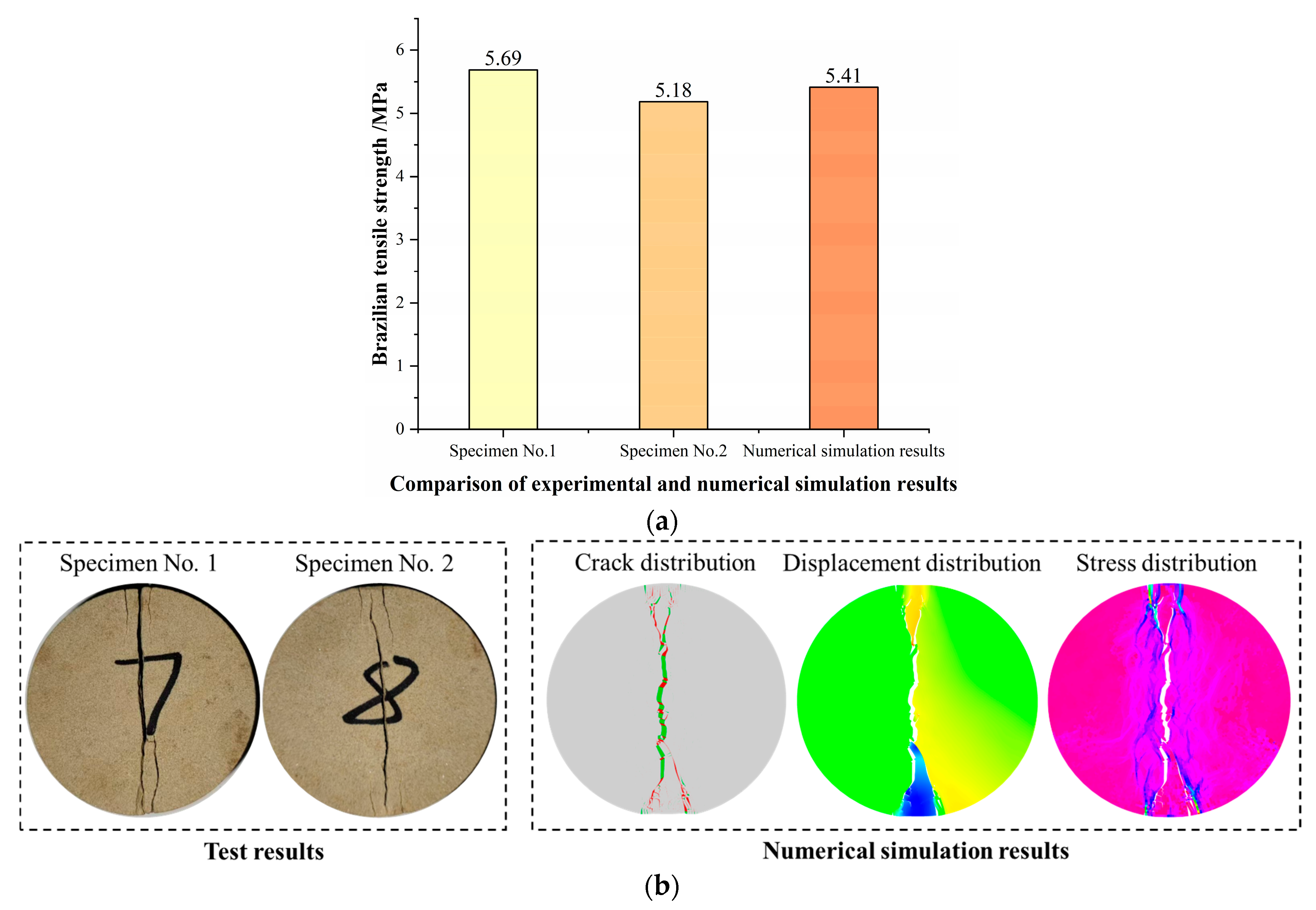 A sample of yellow sandstone collected from the site is selected to prepare 50 × 25 mm Brazilian disk specimens. Then, the Brazilian splitting test is conducted on the yellow sandstone specimens to obtain the tensile strength and failure mode of the specimens, which will be used for parameter calibration in numerical simulation (as shown in