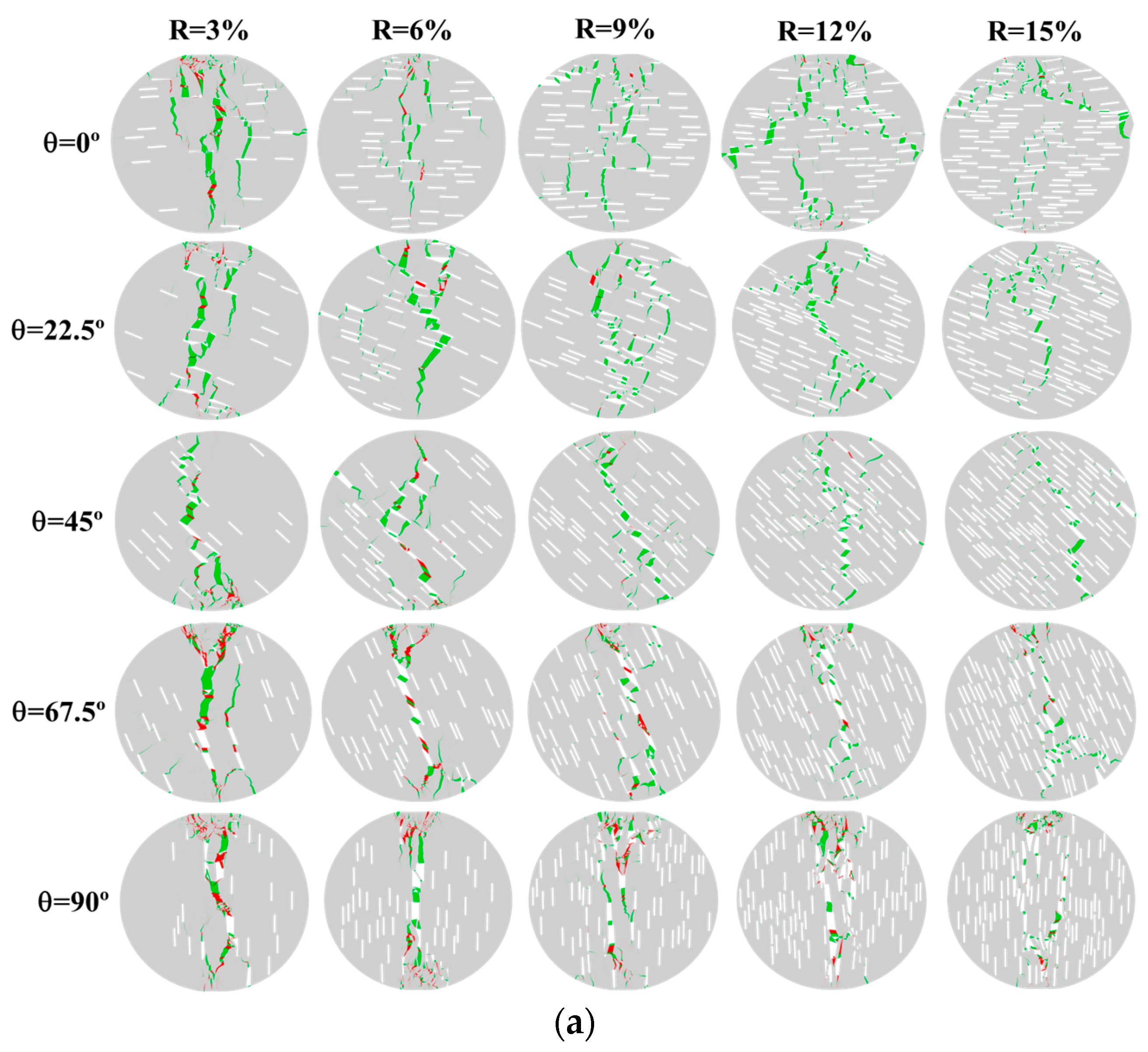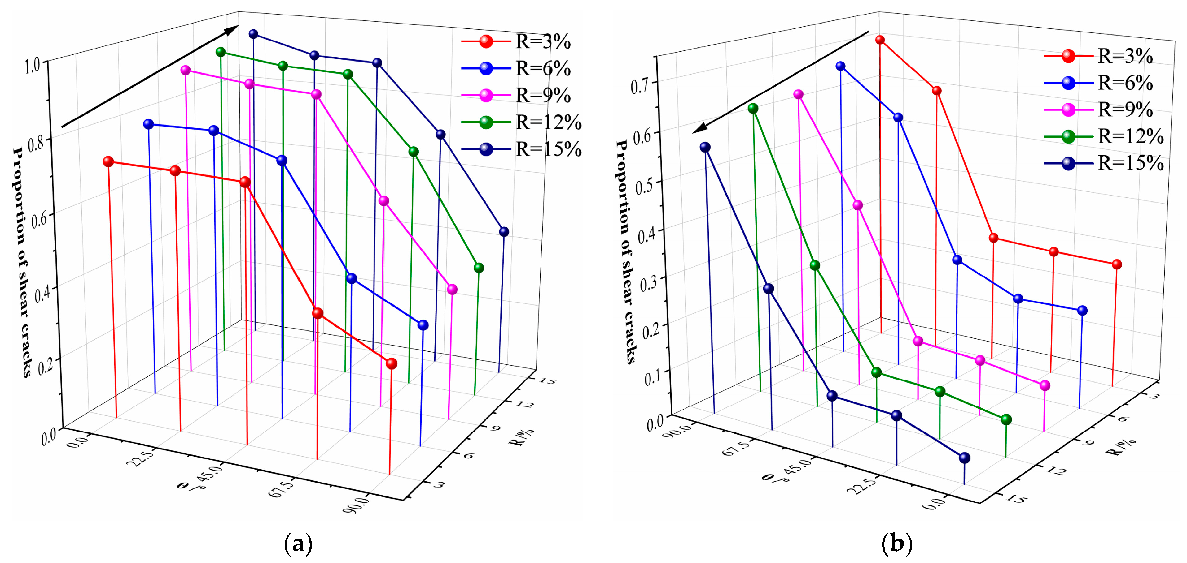 (2) The fissure ratio plays a dominant role in the deviation of the failure path: when θ ≤ 67.5°, as R increases, the main crack gradually deviates from the loading axis from the central vertical failure, and the guiding effect of the initial crack on crack propagation is enhanced; when θ = 90°, due to the crack being parallel to the loading direction, the deviation degree is the smallest. Microscopic crack statistics show that as R increases, the proportion of tensile cracks increases; as θ increases, the contribution of shear cracks is significantly enhanced (after θ > 45°, the proportion of shear increases sharply), indicating that the inclination angle induces shear slip by changing the stress transmission path.