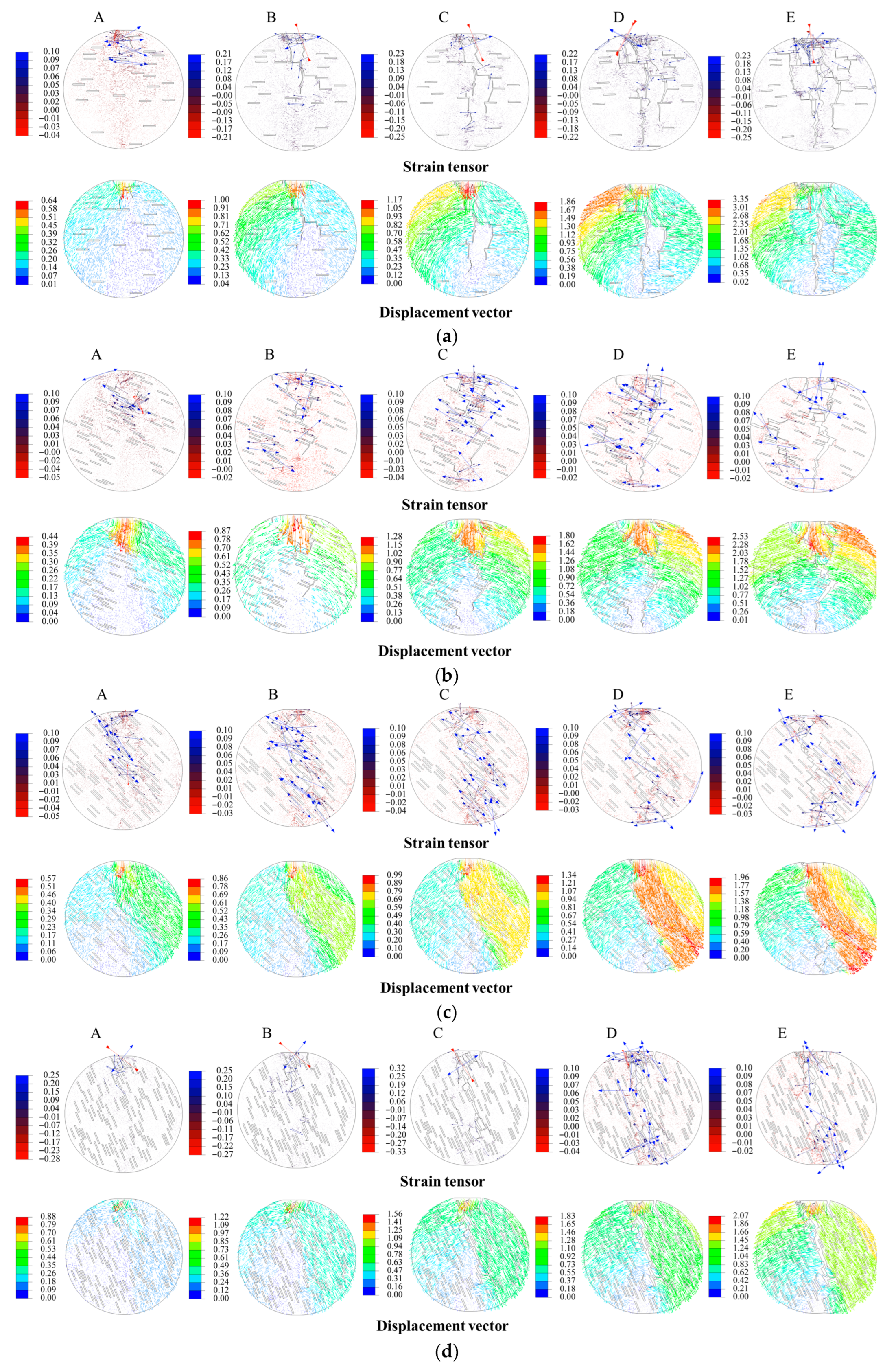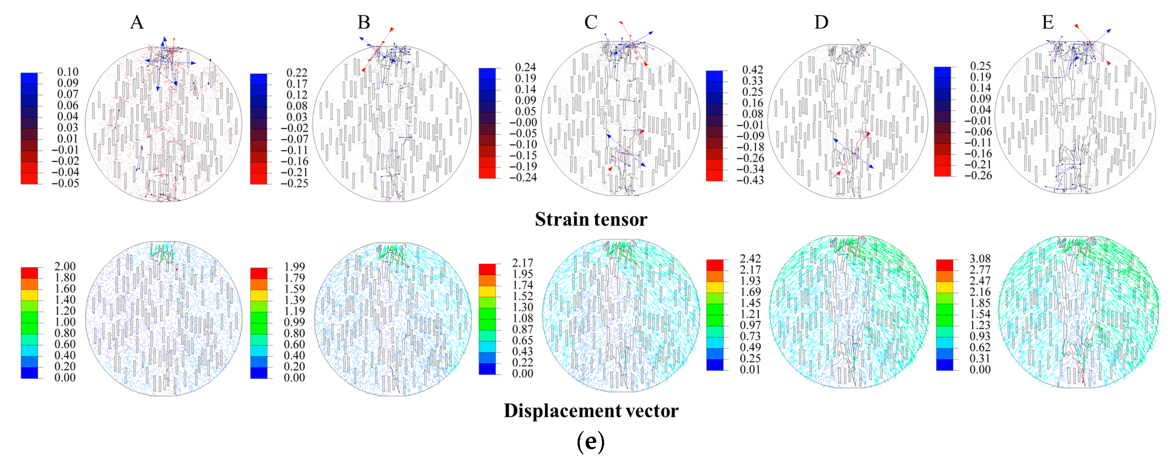 Figure 6, we select a strain tensor and displacement vector cloud map to illustrate the expansion and evolution process of the internal crack of the specimen as it is subjected to loading.