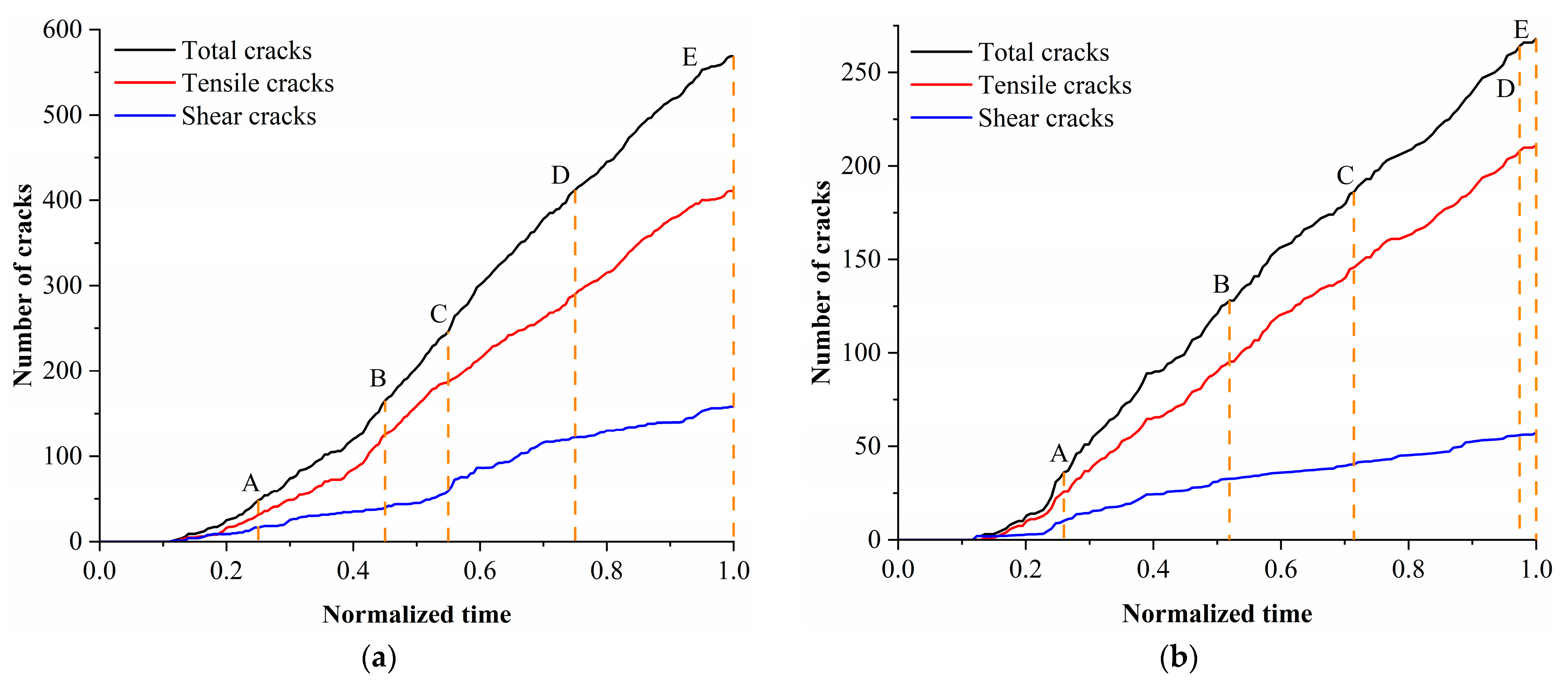 Figure 7 shows the number of total cracks, tensile cracks, and shear cracks with the loading time. The specific analysis is as follows: