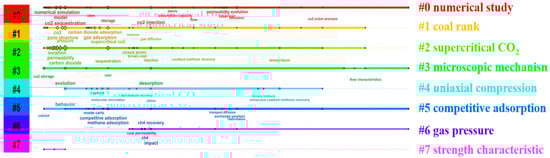 Gas injection displacement technology enhances CBM recovery and gas extraction efficiency by injecting CO2/N2, with the dual benefits of energy recovery and CO2 sequestration. It applies to two scenarios: surface well CBM development (focused on CO2 sequestration and efficient methane recovery [1,2]), and underground gas disaster prevention suppressing CBM protrusion via borehole gas injection [3]. Scholars have verified its feasibility and accumulated data through laboratory experiments [4,5] and field trials [6,7]. Numerical simulation, as a tool to reveal the gas injection multi-field coupling mechanism and optimize parameters, compensates for high field test costs and limited laboratory scales [8,9], becoming key for in-depth research. Figure 1 (from CiteSpace analysis of literature from 2015 to 2025) shows keywords’ co-occurrence and evolution, indicating growing research on gas injection displacement numerical simulation, with progress in CO2 injection–storage, simulation models, and permeability model evolution—highlighting simulation’s role in unraveling displacement mechanisms.