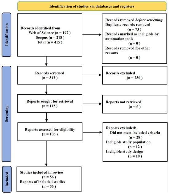 Eligibility: The full texts of the remaining 112 articles were sought for retrieval, of which 106 were successfully accessed. These 106 articles were thoroughly assessed for eligibility. A further 50 articles were excluded for specific reasons: not meeting the inclusion criteria (n = 28), ineligible study population (n = 12), or ineligible study design (n = 10). Ultimately, 56 studies were identified as relevant and form the basis of this mini-review. The entire process is summarized in Figure 2 to enhance transparency.