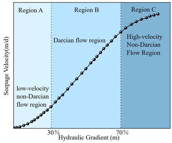 The law assumes linear gas flow and only applies when the Reynolds number is 1–10. Excessive flow rates or non-Newtonian fluid behavior can cause non-Darcy flow [17,18,19]. As shown in Figure 3: there is a minimum pressure gradient threshold in Zone A (low-speed non-Darcy flow zone) for low-speed flow, below which there is no flow, and beyond which the flow rate rises slowly with the gradient but does not follow a linear trend; the flow growth rate tends to slow down due to inertial effects deviating from linearity at high hydraulic gradients in Zone C (high-velocity non-Darcy-flow zone). For low-permeability first-mined coal seams, low-velocity gas flow exhibits the Klinkenberg effect; neglecting this leads to overestimated gas pressure [20]. At this point, the description of gas flow needs to be corrected on the basis of continuous flow through the Klinkenberg effect [21]: