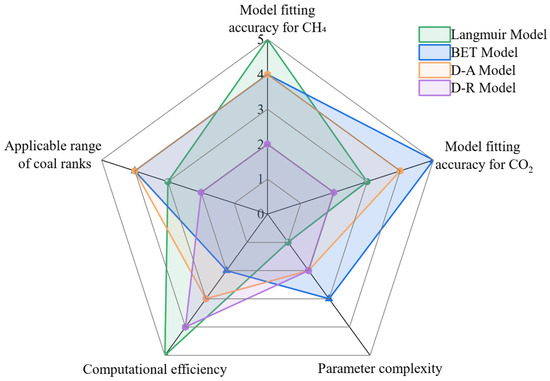 As a porous medium, coal exhibits strong adsorption capacity for CBM. The Langmuir monolayer adsorption equation (1916), validated by numerous scholars, stands as a classic isothermal adsorption model. Other widely used alternatives include the D-A (Dubinin–Astakhov), BET (Brunauer–Emmett–Teller), and D-R (Dubinin–Radushkevich) models [22,23,24]. Figure 4 compares adsorption models (Langmuir, BET, D-A, D-R). The scores (1–5) in Figure 4 are based on a semi-quantitative assessment derived from a comprehensive review of the literature and the models’ typical performance in practice. The evaluation criteria are as follows: computational efficiency (1 = low, 5 = high): based on model complexity and computational resource demands; parameter complexity (1 = simple, 5 = complex): based on the number and difficulty of obtaining required parameters; fitting accuracy for CH4 (1 = poor, 5 = excellent): based on reported goodness-of-fit in studies; fitting accuracy for CO2 (1 = poor, 5 = excellent); applicability to multi-gas (1 = single-gas, 5 = multi-gas): assesses the model’s capability to handle competitive adsorption. Models may receive identical scores in a category if their performance in that specific aspect is deemed comparable based on the literature consensus.