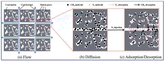 As shown in Figure 5, gas flows in the coal’s natural fracture network (cleat system) following Darcy’s law, with its transport rate controlled by fracture openness, connectivity, and inhomogeneity. During gas injection, the fracture pressure gradient drives the injected gas to preferentially migrate along dominant flow pathways. Mathematically, this Darcy-based flow in the fracture system can be described by the following equation:
