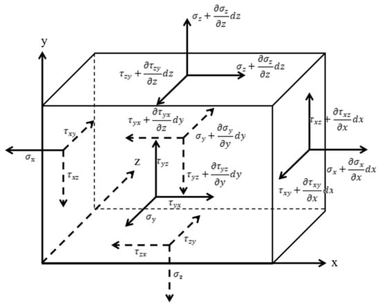 The force is the fundamental cause of the deformation and movement of the coal body; gas injection displacement of pre-drilled holes will cause plastic damage to the coal body in the mining space and around the holes, while the coal body unaffected by mining will remain in an elastic state of deformation. According to the assumption, the coal body is a linear elastic body, which will be elastically deformed by the stratum stress and fluid pressure and other effects. A tiny representative element volume (REV) is arbitrarily taken inside the coal body with side lengths dx, dy, and dz, as shown in Figure 6. The REV is subjected to both surface stresses and volume forces, which are uniformly distributed forces.