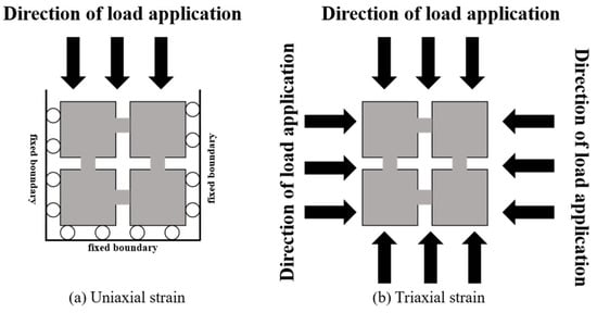Coal stress field mathematical models are divided into two main categories: First, the uniaxial strain assumption (Figure 7a), which ignores lateral displacement and considers only the strain caused by overlying pressure, is applicable to the analysis of a wide range of coal seams, and the classical permeability model constructed based on it couples the fracture compressibility and pore permeability relationship, while other studies derive the horizontal effective stress change and establish an exponential permeability model. Second, the triaxial compressive strain model considers three-dimensional stress–strain (Figure 7b), which is more accurate in analysis but complex in modeling, e. g., the internal expansion coefficient λ is introduced in the triaxial state, and a new permeability model is established to quantify the effect of matrix–fracture interaction and creep on permeability [42,43,44].
