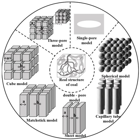 Schematic diagram of the pore structure composition and simplified physical model of the coal body.
