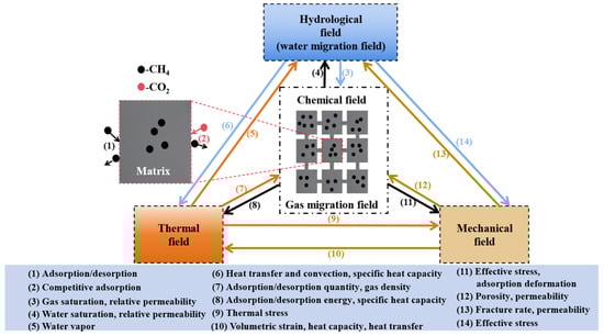 - Fang, H.; Yu, S.; Zhang, S.; Sang, S.; Guo, J.; Wang, Z.; Wang, X. Coupling Mechanism of THMC Fields in Crushed Soft Coal with Low Permeability after CO2 Injection and Its Application in CO2-ECBM Technology. Energy Fuels 2024, 38, 6891–6911. [Google Scholar] [CrossRef]