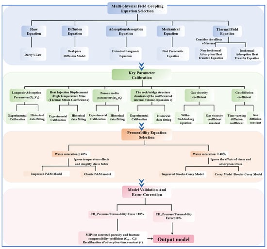Under complex geological conditions, numerical simulation of gas injection displacement in coal seams faces challenges such as differentiated model applicability, high parameter sensitivity, and limited computational efficiency. The systematic review in Section 4.1 confirms that no single model is universally applicable. Furthermore, analysis of high-precision models (with errors ≤10%) in Table 6 informed the construction of a four-dimensional decision-making framework (Figure 11) to enhance the scientific rigor and engineering applicability of model selection. This framework sequentially addresses four core questions to build confidence in simulation results, from theoretical foundation to practical reliability: (1) Governing physical equations? (Multi-physical Field Coupling Equation Selection); (2) Accurate input parameters? (Key Parameter Calibration); (3) Evolution of the core property—permeability? (Permeability Equation Selection); and (4) Trustworthy model output? (Model Validation and Error Correction). While aspects like mesh generation are important, this framework focuses on the most critical, high-level decisions impacting model accuracy and applicability. The decision-making process is as follows (Figure 11):