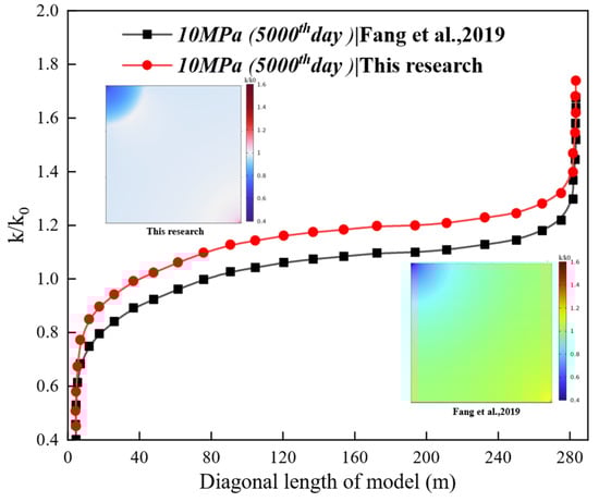 Due to the scarcity of time-evolving field permeability data, the simulation results from Fang et al. [59]—whose model was field-validated—served as the benchmark. For this validation case, the decision tree was applied, leading to the selection of the THM coupling equations and the improved P&M model for permeability evolution. Key parameters (e.g., Langmuir constants, initial permeability, porosity) were primarily sourced from experimental data related to the Qinshui Basin 3# coal seam [59]. Where necessary, minor calibrations were made within physically reasonable ranges to achieve a history match with the initial production data.
