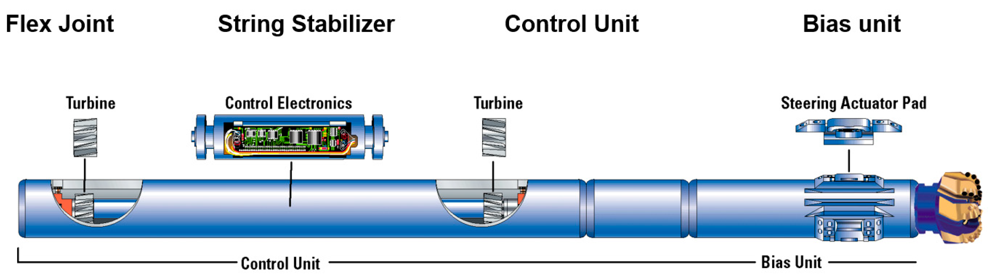 - Akinniranye, G.; Kruse, W.D.; Bautista Gomez, A.; Poedjono, B.; Dubose, B.; Goobie, R.B.; Hobin, J. Rotary Steerable System Technology Case Studies in a High-Volume, Low-Cost Environment. In Proceedings of the SPE Middle East Oil and Gas Show and Conference, SPE, Manama, Bahrain, 11–14 March 2007; p. SPE-105468-MS. [Google Scholar]