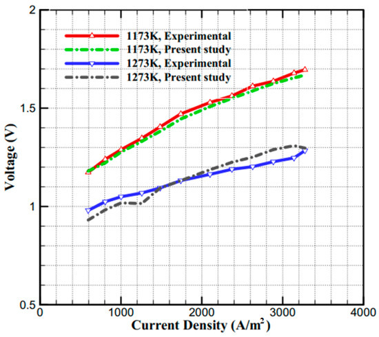 The comparison of the Voltage–Current Density curves from the model simulations and results from Ref. [34].