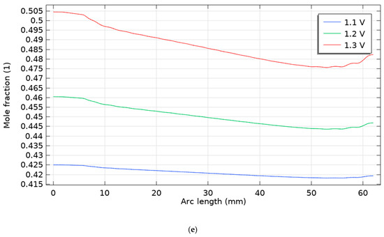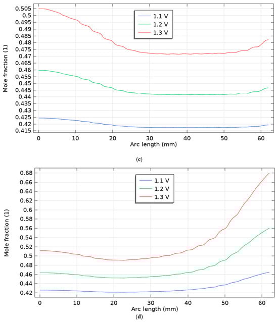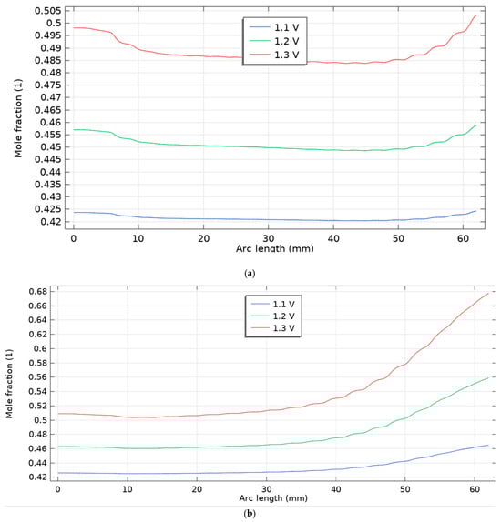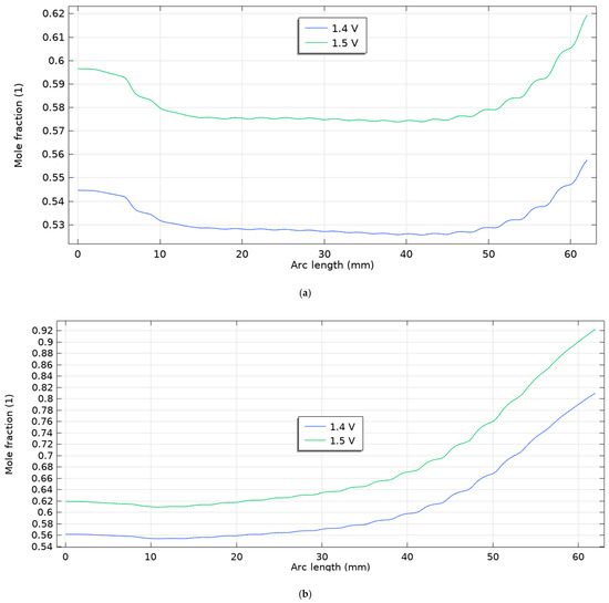 As shown in Figure 7, at higher drive voltages (1.4–1.5 V), the hydrogen mole-fraction profiles diverge noticeably between the two scenarios. Scenario 1 (first figure) remains nearly uniform along the channel: both curves begin near ~0.54–0.60, show a shallow mid-channel dip, and recover only modestly toward the outlet, with 1.5 V consistently offset above 1.4 V by a nearly constant gap—i.e., voltage mainly raises the baseline level rather than steepening the axial gradient. In contrast, Scenario 2 (second figure) exhibits a monotonic enrichment: starting near ~0.56 (1.4 V) and ~0.60 (1.5 V), the profiles climb steadily with arc length, reaching ~0.79 and ~0.93, respectively, indicating stronger reactant conversion and a much higher voltage sensitivity of the axial composition. When compared with the lower-voltage cases (1.1–1.3 V; see previous figures), both scenarios follow the same qualitative ordering—higher voltage → higher H2 mole fraction everywhere—but the magnitude of change with position is small in Scenario 1 and becomes progressively amplified in Scenario 2. These results suggest that the operating configuration in Scenario 2 enhances transport/kinetics sufficiently that increasing the voltage not only elevates the overall H2 level but also drives a pronounced axial build-up, whereas Scenario 1 remains diffusion-limited and closer to a flat profile even at 1.5 V.