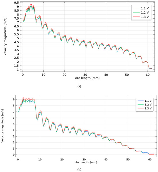 Fluid velocity changes inside the cathode channel: (a) scenario 1, (b) scenario 2.
