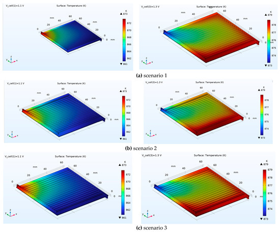 Figure 9 presents the 3D temperature distribution of the SOEC for Scenarios 1, 2, and 3 at applied voltages of 1.1 V and 1.3 V (the boundary conditions for the cathode, anode, and additional channels remained unchanged). One objective of this analysis was to demonstrate that, despite the cell’s compact size (64 mm × 60 mm with a width of only 2.518 mm), a considerable temperature variation exists across the cell domain. The simulation results clearly indicate that even in such a small structure, a non-uniform temperature distribution is evident; however, this distribution tends to become more uniform with increasing voltage. In Scenario 1, the cell temperature not only increases with higher voltage but also shows a move towards uniformity, with maximum temperatures of 837 K and 879 K at 1.1 V and 1.3 V, respectively. Critically, the results show that changes in the channel cross-section have little impact on the temperature distribution. It can therefore be concluded that the primary reason for the increased molar hydrogen production in Scenarios 2 and 4 is the effective regulation of fluid velocity within the channel, which enhances residence time and mass transport, rather than a thermal effect.