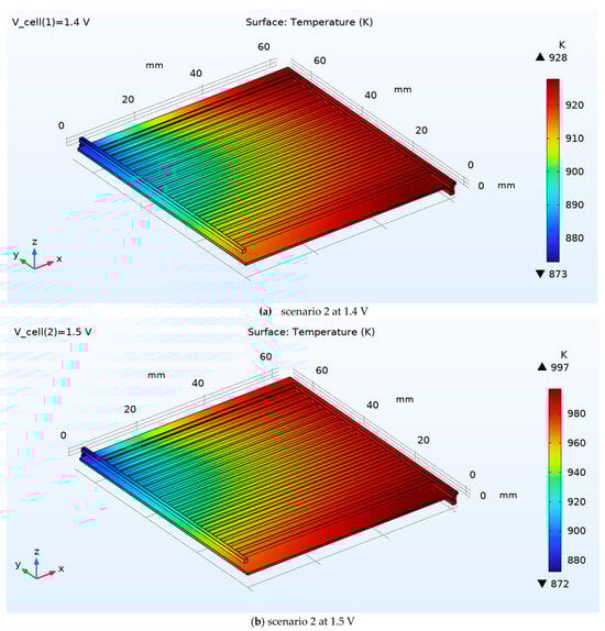 In Scenario 2, the three-dimensional temperature field remains smooth and predominantly aligned with the channel direction, with a clear streamwise rise from the inlet plenum (cool end) toward the outlet. At 1.4 V (Figure 10a), temperatures span roughly 873–928 K, producing a moderate axial gradient while preserving good lateral uniformity across neighboring channels (only weak banding associated with the rib/channel pattern). Raising the drive to 1.5 V (Figure 10b) amplifies Joule and reaction heat release, broadening the range to ≈ 872–997 K and steepening the axial gradient; peak temperatures shift to the downstream corner near the outlet manifold, consistent with higher current density and longer residence for heat accumulation. Despite the overall increase, the field remains free of localized hot spots within the active area, indicating that Scenario 2’s flow/geometry provides effective transverse heat spreading while voltage primarily controls the magnitude, not the shape, of the temperature distribution.