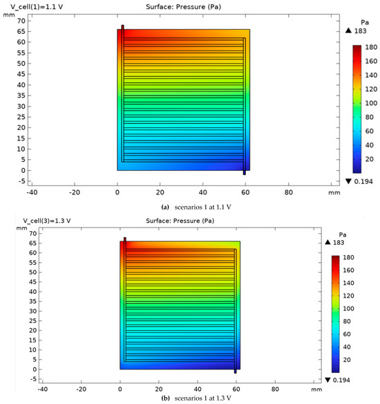 The pressure variation on the cathode side for scenarios 1 for two voltages, 1.1 and 1.3 V.