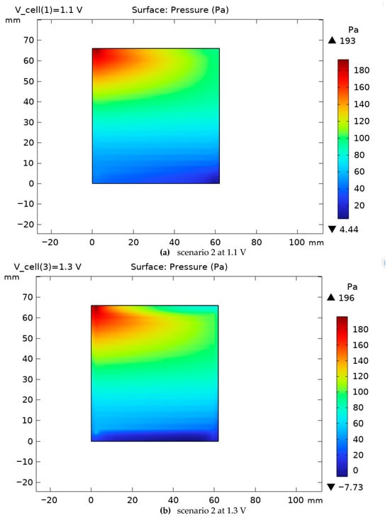 The pressure variation on the cathode side for scenarios 1 and 2 is shown in Figure 12 and Figure 13. Increasing the voltage from 1.1 to 1.3 V leads to an increase in the current density and hydrogen gas production on the cathode side. As illustrated in the comparison between Figure 9 and Figure 10, an increase in operating voltage results in a rise in cell pressure from 180 Pa to 183 Pa. This initial pressure increase is primarily a consequence of enhanced electrochemical activity, which leads to a higher rate of hydrogen gas production at elevated voltages. Furthermore, the data from Figure 10 demonstrates that modifications to the cell’s cross-sectional area induce a more substantial pressure increase, reaching 193 Pa. This represents a significant 7% rise compared to the baseline. Consequently, it can be concluded that Scenarios 2 through 5 will be characterized by a greater hydrogen output, a correspondingly higher internal pressure, and an associated increase in the system’s energy consumption. Gas compressibility and mixture state. Gas phases are treated as ideal, low-Mach compressible mixtures. The local density is evaluated from the mixture state as . Transport properties and enter the momentum and species equations in the channel domains; the porous electrodes/GDLs use a Darcy–Brinkman form with the same state-dependent properties. The flow remains subsonic with Ma ≪ 0.3, so compressibility appears through property variation without acoustic effects.