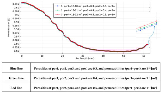 Acorrdong to Figure 14, porosities of the gas-diffusion layers and electrodes—por1 (CGDL), por2 (GDEC), por3 (GDEA), and por4 (AGDL) together with their corresponding permeabilities (per1–per4), were systematically varied. The outlet hydrogen mole fraction increases monotonically with porosity and, for the outlet-side CGDL-AGDL, decreases with permeability (i.e., lower k yields higher xH2 Specifically, when all porous layers are set to ε = 0.5 (red curve) and the outlet CGDL-AGDL permeability is k = 10−12, the profile shows the highest enrichment along the channel, with the largest separation emerging near the outlet. Physically, higher ε reduces tortuosity and raises the effective diffusivity and accessible TPB area, thereby lowering concentration polarization and improving reactant/product transport through CGDL/CGDE/AGDE. In parallel, a smaller k in AGDL suppresses cross-flow/bypass and increases the local residence time, which promotes conversion and accumulates H2 toward the outlet—hence the steeper terminal rise of the red curve. The near-inlet overlap of all curves indicates a kinetics-dominated region where transport resistances are weak; sensitivity grows downstream as the regime becomes transport-limited.